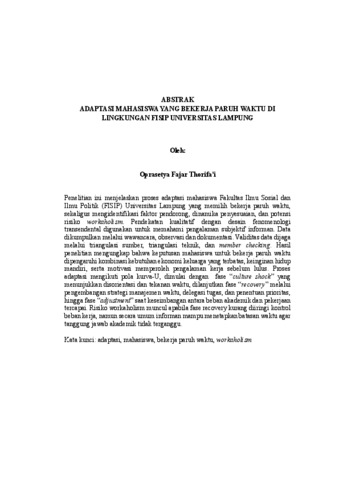 Penelitian ini menjelaskan proses adaptasi mahasiswa Fakultas Ilmu Sosial dan Ilmu Politik (FISIP) Universitas Lampung yang memilih bekerja paruh waktu, sekaligus mengidentifikasi faktor pendorong, dinamika penyesuaian, dan potensi risiko workaholism. Pendekatan kualitatif dengan desain fenomenologi transendental digunakan untuk memahami pengalaman subjektif informan. Data dikumpulkan melalui wawancara, observasi dan dokumentasi. Validitas data dijaga melalui triangulasi sumber, triangulasi teknik, dan member checking. Hasil penelitian mengungkap bahwa keputusan mahasiswa untuk bekerja paruh waktu dipengaruhi kombinasi kebutuhan ekonomi keluarga yang terbatas, keinginan hidup mandiri, serta motivasi memperoleh pengalaman kerja sebelum lulus. Proses adaptasi mengikuti pola kurva-U, dimulai dengan fase “culture shock” yang menunjukkan disorientasi dan tekanan waktu, dilanjutkan fase “recovery” melalui pengembangan strategi manajemen waktu, delegasi tugas, dan penentuan prioritas, hingga fase “adjustment” saat keseimbangan antara beban akademik dan pekerjaan tercapai. Risiko workaholism muncul apabila fase recovery kurang diiringi kontrol beban kerja, namun secara umum informan mampu menetapkan batasan waktu agar tanggung jawab akademik tidak terganggu. Kata kunci: adaptasi, mahasiswa, bekerja paruh waktu, workaholism This study explaining the adaptation process of students at the Faculty of Social and Political Sciences (FISIP) of the University of Lampung who choose to work part-time, while identifying the driving factors, dynamics of adjustment, and potential risks of workaholism. A qualitative approach with a transcendental phenomenological design was used to understand the subjective experiences of the informants. Data was collected through interviews, observations, and documentation. Data validity was ensured through source triangulation, technique triangulation, and member checking. The results revealed that students' decisions to work part-time were influenced by a combination of limited family economic needs, the desire for independence, and the motivation to gain work experience before graduation. The adaptation process follows a U-shaped curve, beginning with the “culture shock” phase, which shows disorientation and time pressure, followed by the “recovery” phase through the development of time management strategies, task delegation, and priority setting, until the “adjustment” phase when a balance between academic workload and work is achieved. The risk of workaholism arises if the recovery phase is not accompanied by workload control, but generally, informants are able to set time boundaries to ensure academic responsibilities are not disrupted. Keywords: adaptation, students, part-time work, workaholism