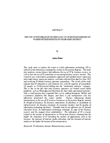Penelitian ini bertujuan untuk mengeksplorasi sejauh mana pemanfaatan teknologi informasi (TI) dalam aktivitas usaha mikroyang dikelola oleh wanita di Kabupaten Pesawaran. Studi ini juga menganalisis berbagai faktor yang memengaruhi penggunaan TI oleh pelaku usaha, serta bagaimana pemanfaatan TI berkontribusi terhadap peningkatan pendapatan pelaku usaha. Penelitian ini menggunakan pendekatan kuantitatif deskriptif dan analisis regresi linear berganda dan regresi linear sederhana, dengan data yang dikumpulkan pada April hingga Juni 2025 dan melibatkan 97 responden pelaku usaha wanita. Hasil penelitian menunjukkan bahwa pemanfaatan TI masih tergolong rendah, mayoritas responden yaitu sebanyak 52 orang (53,60 persen) tergolong dalam kategori “cukup intensif”, ini disebabkan oleh fakta bahwa mayoritas pelaku usaha menggunakan media sosial yang terbatas, seperti WhatsApp dan Facebook untuk menjalankan kegiatan operasional sehari-hari. Hanya sebagian kecil yang telah memperluas penggunaannya dengan menambahkan Instagram, TikTok, dan platform e-commerce seperti Shopee, serta terdapat satu pelaku usaha yang secara efektif menembus pasar ekspor. Faktor-faktor yang mempengaruhi pelaku usaha dalam pemanfaatan TI pada usaha mikro oleh pelaku usaha wanita di Kabupaten Pesawaran meliputi X2 (lama berusaha), X3 (motivasi berusaha), X4 (fasilitas atau ketersediaan infrastruktur), X5 (lokasi usaha), X7 (loyalitas pelanggan), dan X9 (kualitas sarana teknologi informasi). Variabel yang tidak berpengaruh adalah X1 (tingkat pendidikan formal), X6 (pelatihan teknologi informasi), X8 (umur pelaku usaha), dan X10 (dukungan dari stakeholders). Pemanfaatan TI berkaitan erat dengan pendapatan pelaku usaha di Kabupaten Pesawaran, artinya semakin tinggi pemanfaatan TI yang meliputi jumlah aplikasi yang digunakan dalam usaha, intensitas pemanfaatan media internet dan durasi penggunaan media internet, maka semakin tinggi pula pendapatan pelaku usaha. Kata kunci: pemanfaatan TI, Pendapatan, Pelaku usaha wanita This study aims to explore the extent to which information technology (IT) is utilized in microbusinesses managed by women in Pesawaran Regency. The study also analyzes various factors that influence the use of IT by business owners, as well as how the use of IT contributes to increasing business owners' income. This research uses a descriptive quantitative approach and multiple linear regression and simple linear regression analysis, with data collected from April to June 2025 and involving 97 female business operator respondents. The results of the study indicate that IT utilization is still relatively low, with the majority of respondents (52 people, or 53.60 percent) falling into the “moderately intensive” category. This is due to the fact that most business operators use limited social media platforms, such as WhatsApp and Facebook, for their daily operational activities. Only a small portion have expanded their use by adding Instagram, TikTok, and e-commerce platforms like Shopee, and there is one entrepreneur who has effectively penetrated the export market. Factors influencing female entrepreneurs in the use of IT in micro businesses in Pesawaran Regency include X2 (length of business), X3 (business motivation), X4 (facilities or availability of infrastructure), X5 (business location), X7 (customer loyalty), and X9 (quality of information technology facilities). Variables that do not influence are X1 (formal education level), X6 (information technology training), X8 (age of the business owner), and X10 (support from stakeholders). The utilization of IT is closely related to the income of entrepreneurs in Pesawaran District, meaning that the higher the utilization of IT including the number of applications used in the business, the intensity of internet media utilization, and the duration of internet media use the higher the income of the entrepreneurs. Keywords: IT utilization, Income, Women business owners