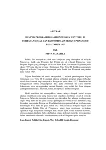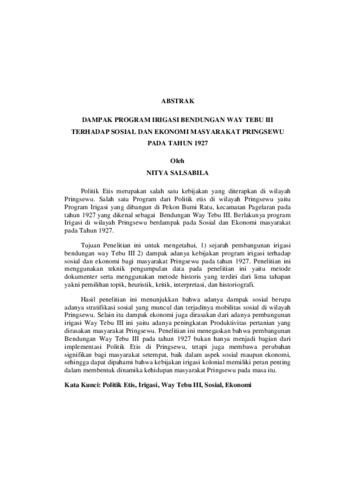 Politik Etis merupakan salah satu kebijakan yang diterapkan di wilayah Pringsewu. Salah satu Program dari Politik etis di wilayah Pringsewu yaitu Program Irigasi yang dibangun di Pekon Bumi Ratu, kecamatan Pagelaran pada tahun 1927 yang dikenal sebagai Bendungan Way Tebu III. Berlakunya program Irigasi di wilayah Pringsewu berdampak pada Sosial dan Ekonomi masyarakat pada Tahun 1927. Tujuan Penelitian ini untuk mengetahui, 1) sejarah pembangunan irigasi bendungan way Tebu III 2) dampak adanya kebijakan program irigasi terhadap sosial dan ekonomi bagi masyarakat Pringsewu pada tahun 1927. Penelitian ini menggunakan teknik pengumpulan data pada penelitian ini yaitu metode dokumenter serta menggunakan metode historis yang terdiri dari lima tahapan yakni pemilihan topik, heuristik, kritik, interpretasi, dan historiografi. Hasil penelitian ini menunjukkan bahwa adanya dampak sosial berupa adanya stratifikasi sosial yang muncul dan terjadinya mobilitas sosial di wilayah Pringsewu. Selain itu dampak ekonomi juga dirasakan dari adanya pembangunan irigasi Way Tebu III ini yaitu adanya peningkatan Produktivitas pertanian yang dirasakan masyarakat Pringsewu. Penelitian ini menegaskan bahwa pembangunan Bendungan Way Tebu III pada tahun 1927 bukan hanya menjadi bagian dari implementasi Politik Etis di Pringsewu, tetapi juga membawa perubahan signifikan bagi masyarakat setempat, baik dalam aspek sosial maupun ekonomi, sehingga dapat dipahami bahwa kebijakan irigasi kolonial memiliki peran penting dalam membentuk dinamika kehidupan masyarakat Pringsewu pada masa itu. Kata Kunci: Politik Etis, Irigasi, Way Tebu III, Sosial, Ekonomi Ethical Politics is one of the policies implemented in the Pringsewu area. One of the programs from Ethical Politics in the Pringsewu area is the Irrigation Program built in Pekon Bumi Ratu, Pagelaran sub-district in 1927, known as the Way Tebu III Dam. The implementation of the Irrigation Program in the Pringsewu area impacted the social and economic lives of the community in 1927. The purpose of this study is to determine: 1) the history of the Way Tebu III dam irrigation development; and 2) the impact of the irrigation program policy on the social and economic lives of the Pringsewu community in 1927. This research uses data collection techniques in this study, namely the documentary method, and employs the historical method consisting of five stages: topic selection, heuristics, criticism, interpretation, and historiography. The results of this study indicate that there is a social impact in the form of social stratification emerging and social mobility occurring in the Pringsewu area. In addition, the economic impact of the construction of the Way Tebu III irrigation system is also being felt, namely an increase in agricultural productivity experienced by the people of Pringsewu. This research confirms that the construction of the Way Tebu III Dam in 1927 was not only part of the implementation of Ethical Policy in Pringsewu, but also brought significant changes to the local community, both socially and economically. Therefore, it can be understood that colonial irrigation policies played an important role in shaping the dynamics of life for the Pringsewu