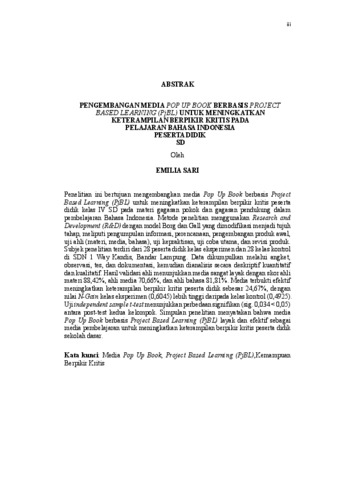 EMILIA , SARI (2025) PENGEMBANGAN MEDIA POP UP BOOK BERBASIS PROJECT BASED LEARNING (PjBL) UNTUK MENINGKATKAN KETERAMPILAN BERPIKIR KRITIS PADA PELAJARAN BAHASA INDONESIA PESERTA DIDIK SD. Masters thesis, UNIVERSITAS LAMPUNG .