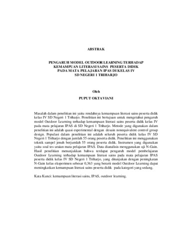 Masalah dalam penelitian ini yaitu rendahnya kemampuan literasi sains peserta didik kelas IV SD Negeri 1 Triharjo. Penelitian ini bertujuan untuk mengetahui pengaruh model Outdoor Learning terhadap kemampuan literasi sains peserta didik kelas IV pada mata pelajaran IPAS di SD Negeri 1 Triharjo. Metode yang digunakan dalam penelitian ini adalah quasi experimental dengan desain nonequivalent control group design. Populasi dalam penelitian ini adalah seluruh peserta didik kelas IV SD Negeri 1 Triharjo dengan jumlah 55 orang peserta didik. Penelitian ini menggunakan teknik sampel jenuh berjumlah 55 orang peserta didik. Instrumen yang digunakan yaitu soal tes uraian mata pelajaran IPAS. Data dianalisis menggunakan uji N-Gain. Hasil penelitian menunjukkan bahwa terdapat pengaruh model pembelajaran Outdoor Learning terhadap kemampuan literasi sains pada mata pelajaran IPAS peserta didik kelas IV SD Negeri 1 Triharjo, yang ditunjukan dengan peningkatan N-Gain kelas eksperimen sebesar 0,363 yang berarti model Outdoor Learning dapat meningkatkan kemampuan literasi sains peserta didik pada kategori yang sedang. Kata Kunci: kemampuan literasi sains, IPAS, outdoor learning. The problem in this study was the low scientific literacy skills of Grade IV students at SD Negeri 1 Triharjo. This study aimed to determine the effect of the Outdoor Learning model on the scientific literacy skills of Grade IV students in the IPAS subject at SD Negeri 1 Triharjo. The method used in this research was quasi- experimental with a nonequivalent control group design. The population of this study consisted of all Grade IV students at SD Negeri 1 Triharjo, totaling 55 students. This research used a saturated sampling technique involving all 55 students. The instrument used was an essay test in the IPAS subject. Data were analyzed using the N-Gain test. The results showed that the Outdoor Learning model had an effect on students' scientific literacy skills in the IPAS subject, as indicated by an N-Gain increase of 0.363 in the experimental class, which means the Outdoor Learning model could improve students' scientific literacy skills to a moderate category. Keywords: scientific literacy skills, sciens, outdoor learning.