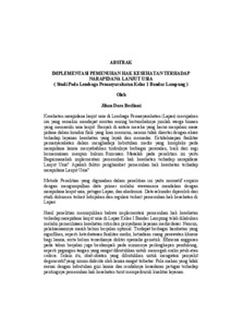 Kesehatan narapidana lanjut usia di Lembaga Pemasyarakatan (Lapas) merupakan isu yang semakin mendapat sorotan seiring bertambahnya jumlah warga binaan yang memasuki usia lanjut. Banyak di antara mereka yang harus menjalani masa pidana dalam kondisi fisik yang kian menurun, namun tidak disertai dengan akses terhadap layanan kesehatan yang layak dan memadai. Ketidaksiapan fasilitas pemasyarakatan dalam menghadapi kebutuhan medis yang kompleks pada narapidana lansia menyebabkan timbulnya berbagai persoalan, baik dari segi kemanusiaan maupun hukum. Rumusan Masalah pada penelitian ini yaitu Bagaimanakah implementasi pemenuhan hak kesehatan terhadap narapidana Lanjut Usia? Apakah faktor penghambat pemenuhan hak kesehatan terhadap narapidana Lanjut Usia? Metode Penelitian yang digunakan dalam penelitian ini yaitu normatif empiris dengan mengumpulkan data primer melalui wawancara mendalam dengan narapidana lanjut usia, petugas Lapas, dan akademisi. Data sekunder diperoleh dari studi dokumen terkait kebijakan dan regulasi terkait pemenuhan hak kesehatan di Lapas. Hasil penelitian menunjukkan bahwa implementasi pemenuhan hak kesehatan terhadap narapidana lanjut usia di Lapas Kelas I Bandar Lampung telah dilakukan melalui pemeriksaan kesehatan rutin dan penyediaan layanan medis dasar. Namun, pelaksanaannya masih belum berjalan optimal. Terdapat berbagai hambatan yang signifikan, seperti keterbatasan fasilitas medis, ketiadaan ruang perawatan khusus bagi lansia, serta belum tersedianya dokter spesialis geriatrik. Efisiensi anggaran pada tahun berjalan juga berdampak pada minimnya perlengkapan pendukung, seperti pegangan tangan yang sangat dibutuhkan untuk mencegah risiko jatuh atau cedera. Selain itu, obat-obatan yang dibutuhkan untuk mengatasi penyakit degeneratif yang umum diderita oleh lansia sangat terbatas. Pola makan yang tidak sesuai dengan kebutuhan gizi lansia dan rendahnya kesadaran petugas terhadap pentingnya pemenuhan hak kesehatan turut memperburuk kualitas layanan. Jihan Dara Berliani Kurangnya keterlibatan keluarga dalam proses perawatan dan pengawasan juga menjadi faktor penghambat yang tidak bisa diabaikan. Dari berbagai faktor tersebut, keterbatasan sarana dan prasarana menjadi hambatan paling dominan karena langsung memengaruhi mutu dan keberlanjutan layanan kesehatan. Saran penelitian menekankan pentingnya pendekatan yang humanis dan adil, penguatan regulasi, peningkatan anggaran, fasilitas ramah lansia, tenaga medis yang kompeten, dan perubahan paradigma petugas yang lebih berorientasi pada hak asasi manusia. Kata Kunci : Lembaga Pemasyarakatan, Narapidana Lanjut Usia, Pemenuhan Hak Kesehatan