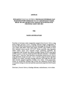 Penelitian ini bertujuan untuk menganalisis pengaruh dari financial distress yang diukur dengan Springate S-Score, teknologi informasi dengan menggunakan IT Spending, dan faktor makroekonomi terdiri dari suku bunga dan nilai tukar terhadap return saham pada Badan Usaha Milik Negara (BUMN) yang terdaftar di Bursa Efek Indonesia selama periode 2019-2023. Metode penelitian yang digunakan adalah analisis regresi linier berganda dengan pendekatan kuantitatif, dan menggunakan data sekunder dari laporan keuangan tahunan BUMN yang dipilih melalui purposive sampling. Sampel penelitian diperoleh sebanyak 17 perusahaan dengan total 77 observasi. Hasil penelitian menunjukkan bahwa financial distress yang diproksikan dengan Springate S-Score memiliki pengaruh positif signifikan terhadap return saham, sementara teknologi informasi, suku bunga dan nilai tukar tidak memiliki pengaruh signifikan terhadap return saham. Secara keseluruhan, temuan ini memberikan wawasan bagi investor dan manajemen BUMN dalam merumuskan strategi investasi dan keputusan operasional yang lebih efektif di pasar modal. Kata kunci: financial distress, teknologi informasi, makroekonomi, return saham This study aims to analyze the impact of financial distress, measured by the Springate S-Score, information technology using IT spending, and macroeconomic factors consisting of interest rates and exchange rates on stock returns of State- Owned Enterprises (SOEs) listed on the Indonesia Stock Exchange during the period of 2019-2023. The research method used is multiple linear regression analysis with a quantitative approach, utilizing secondary data from annual financial reports of SOEs selected through purposive sampling. The sample consists of 17 companies with a total of 77 observations. The results show that financial distress, as proxied by the Springate S-Score, has a significant positive effect on stock returns, while information technology, interest rates, and exchange rates do not have a significant impact on stock returns. Overall, these findings provide insights for investors and SOE management in formulating more effective investment strategies and operational decisions in the capital market. Keywords: Financial distress, information technology, macroeconomics, stock returns