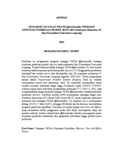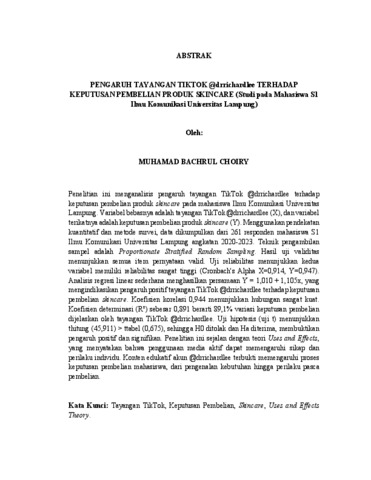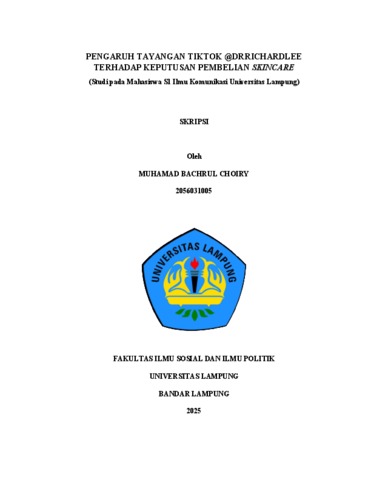 Muhamad Bachrul , Choiry (2025) PENGARUH TAYANGAN TIKTOK @DRRICHARDLEE TERHADAP KEPUTUSAN PEMBELIAN SKINCARE (Studi pada Mahasiswa S1 Ilmu Komunikasi Universitas Lampung). FAKULTAS ILMU SOSIAL DAN ILMU POLITIK, UNIVERSITAS LAMPUNG .