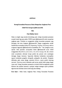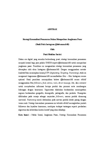 Dalam era digital yang semakin berkembang pesat, strategi komunikasi pemasaran menjadi krusial bagi para pelaku UMKM seperti @kebanana.bfd untuk memperluas jangkauan pasar. Penelitian ini menganalisis strategi komunikasi pemasaran yang diterapkan oleh akun Instagram @kebanana.bfd. Dengan menggunakan metode kualitatif dan menerapkan konsep STP (Segmenting, Targeting, Positioning), studi ini mengamati bagaimana @kebanana.bfd memanfaatkan fitur – fitur Instagram secara optimal. Hasil penelitian menunjukkan bahwa @kebanana.bfd secara efektif menggunakan fitur followers, feed, stories, reels, direct message, like, dan comment untuk menyebarkan informasi berupa produk dan promosi serta membangun hubungan dengan konsumen. Segmentasi dilakukan berdasarkan menempatkan segmen berdasarkan geografis, demografis, psikografis, dan perilaku. Penargetan difokuskan pada remaja sebagai mayoritas followers, namun produk dirancang universal. Positioning merek ditekankan pada inovasi produk kebab pisang dengan varian unik. Strategi komunikasi pemasaran ini terbukti efektif meningkatkan jumlah followers dan loyalitas konsumen, meskipun terdapat tantangan seperti perubahan algoritma dan kebutuhan konten kreatif yang akan dihadapi. Kata kunci : Media Sosial, Jangkauan Pasar, Strategi Komunikasi Pemasaran In the rapidly evolving digital era, marketing communication strategies have become crucial for MSME players like @kebanana.bfd to expand their market reach. This research analyzes the marketing communication strategies implemented by the Instagram account @kebanana.bfd. Using qualitative methods and applying the STP (Segmenting, Targeting, Positioning) concept, this study observes how @kebanana.bfd optimally utilizes Instagram features. The research results show that @kebanana.bfd effectively uses features such as followers, feed, stories, reels, direct message, like, and comment to disseminate information about products and promotions as well as to build relationships with consumers. Segmentation is carried out by placing segments based on geographic, demographic, psychographic, and behavioral factors. Targeting is focused on teenagers as the majority of followers, and the product is designed to be universal. Brand positioning is emphasized on the innovation of banana kebab products with unique variants. This marketing communication strategy has proven effective in increasing the number of followers and consumer loyalty, despite challenges such as algorithm changes and the need for creative content that will be faced.. Keywords : Social media, market reach, marketing communication strategy