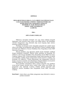 Mahasiswa merupakan kelompok usia yang rentan terhadap pengaruh lingkungan sosial termasuk teman sebaya, gaya hidup modern, dan kemudahan transaksi menggunakan uang elektronik yang secara langsung dapat memicu munculnya perilaku konsumtif. Penelitian ini bertujuan untuk mengetahui pengaruh dari variabel teman sebaya, gaya hidup, dan penggunaan uang elektronik (e-money) terhadap perilaku konsumtif pada Mahasiswa Jurusan Pendidikan Ilmu Pengetahuan Sosial FKIP Universitas Lampung. Metode penelitian yang digunakan adalah metode deskriptif verifikatif dengan pendekatan kuantitatif. Populasi dalam penelitian ini berjumlah 292 mahasiswa aktif Jurusan Pendidikan Ilmu Pengetahuan Sosial FKIP Universitas Lampung Angkatan 2020. Teknik pengambilan sampel dalam penelitian ini adalah non probability sampling dengan menggunakan metode purposive sampling yang berjumlah 169 mahasiswa. Teknik pengumpulan data menggunakan observasi berupa wawancara, kuesioner, dan dokumentasi. Pengujian hipotesis secara parsial dilakukan dengan uji t dan secara simultan dilakukan dengan uji f. Hasil penelitian menunjukkan bahwa terdapat pengaruh yang signifikan secara parsial maupun simultan antara variabel teman sebaya, gaya hidup, dan penggunaan uang elektronik (e-money) terhadap perilaku konsumtif pada Mahasiswa Jurusan Pendidikan Ilmu Pengetahuan Sosial FKIP Universitas Lampung Kata Kunci : teman sebaya, gaya hidup, penggunaan uang elektronik (e-money), perilaku konsumtif Students are an age group that is vulnerable to the influence of the social environment including peers, modern lifestyles, and the ease of transactions using electronic money which can indirectly trigger consumptive behavior. This study aims to determine the effect of peers variables, lifestyle, and the use of electronic money (e-money) on consumptive behavior in students of the Department of Social Science Education FKIP University of Lampung. The research method used is descriptive verification method with a quantitative approach. The population in this study amounted to 292 active students of the department of Social Science Education FKIP University of Lampung class of 2020. The sampling technique in this study was non probability sampling using purposive sampling method which amounted to 169 students. Data collection techniques using observation in the form of interviews, questionnaires, and documentation. Hypothesis testing was partialy carried out with the T test and simultaneously carried out with the F test. The results of the study show that there was a significant partial or simultaneous influence between peer variables, lifestyle, and the use of electronic money (e-money) on consumptive behavior is students of the Department of Social Science Education FKIP University of Lampung Keywords : peers, lifestyle, use of electronic money (e-money), consumptive behavior