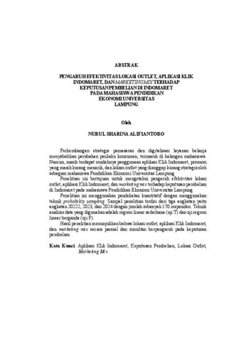 NURUL , SHARINA ALIFIANTORO (2025) PENGARUH EFEKTIVITASLOKASI OUTLET, APLIKASI KLIK INDOMARET, DAN MARKETING MIX TERHADAP KEPUTUSAN PEMBELIAN DI INDOMARET PADA MAHASISWA PENDIDIKAN EKONOMI UNIVERSITAS LAMPUNG. FAKULTAS KEGURUAN DAN ILMU PENDIDIKAN, UNIVERSITAS LAMPUNG.