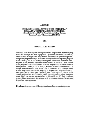 Learning Cycle 5E merupakan model pembelajaran yang berpusat pada siswa yang terdiri dari beberapa fase yaitu engagement, exploration, explanation, elaboration, dan evaluation sehingga siswa berperan aktif untuk dapat menguasai kompetensi- kompetensi yang harus dicapai. Penelitian ini bertujuan untuk mengetahui pengaruh model learning cycle 5E terhadap kemampuan komunikasi matematis siswa. Populasi dalam penelitian ini adalah seluruh kelas VIII SMPN 1 Dente Teladas tahun pelajaran 2024/2025 berjumlah 182 siswa yang berdistribusi ke dalam enam kelas yaitu VIII A sampai VIII F. Sampel penelitian ini adalah siswa kelas VIII B sebagai kelas eksperimen yang terdiri dari 28 siswa dan VIII A sebagai kelas kontrol yang terdiri dari 30 siswa yang terpilih dengan teknik purposive sampling. Pada penelitian ini desain yang digunakan adalah pretest-posttest control group design dan instrumen yang digunakan adalah instrumen tes komunikasi matematis siswa. Hasil analisis data menggunakan uji Mann-Whitney U. Hasil penelitian menunjukkan bahwa model learning cycle 5E berpengaruh terhadap kemampuan komunikasi matematis siswa. Kata kunci: learning cycle 5E, kemampuan komunikasi matematis, pengaruh. Learning Cycle 5E is a student-centered learning model consisting of several phases namely engagement, exploration, explanation, elaboration, and evaluation so that students play an active role in mastering the competencies that must be achieved. This study aims to determine the effect of learning cycle 5E model on students' mathematical communication ability. The population in this study was all VIII grade of SMPN 1 Dente Teladas in the 2024/2025 academic year totalling 182 students distributed into six classes, namely VIII A to VIII F. The samples of this study were students of class VIII B as an experimental class consisting of 28 students and VIII A as a control class consisting of 30 students selected by purposive sampling technique. In this study, the design used was pretest-posttest control group design and the instrument used was a test instrument mathematical communication skill. The results of data analysis using Mann Whitney U test. The results of data analysis using the Mann-Whitney U test. The results showed that the learning cycle 5E model affects students' mathematical communication skills. Keywords: learning cycle 5E, mathematical communication ability, influence