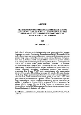 Judi online di Indonesia menjadi salah satu isu sosial yang menimbulkan beragam tanggapan masyarakat. Kementerian Komunikasi dan Digital (Kemkomdigi) telah melakukan berbagai upaya, namun kinerjanya tetap menuai kritik maupun apresiasi publik yang banyak disuarakan melalui media sosial, khususnya Instagram. Penelitian ini bertujuan untuk mengidentifikasi sentimen masyarakat terhadap Kemkomdigi serta membandingkan kinerja algoritma Machine Learning Random Forest dan XGBoost dalam proses klasifikasi. Sebanyak 724 komentar dikumpulkan dari akun Instagram resmi Kemkomdigi dan diberi label manual oleh tiga anotator. Data kemudian melalui tahapan praproses teks (pembersihan, case folding, tokenisasi, normalisasi, penghapusan stopword, dan stemming), representasi fitur dengan TF-IDF, serta penyeimbangan kelas menggunakan Random Oversampling. Model dibangun dengan data latih dan data uji berbanding 70:30, diuji dengan parameter default dan hyperparameter tuning menggunakan GridSearchCV, serta dievaluasi melalui akurasi, presisi, recall, dan F1-score. Hasil penelitian memperlihatkan bahwa algoritma Random Forest memiliki kinerja lebih unggul dibandingkan XGBoost. Setelah dilakukan tuning, Random Forest mencapai akurasi 71,64% dengan F1-score 70,90%, sedangkan XGBoost hanya mencapai akurasi 67,66% dengan F1-score 67,85%. Temuan ini menunjukkan bahwa Random Forest lebih efektif dalam mengklasifikasikan sentimen masyarakat terkait kinerja Kemkomdigi terhadap isu judi online. Kata Kunci: Analisis Sentimen, Judi Online, Klasifikasi, Random Forest, TF-IDF, XGBoost. Online gambling in Indonesia has become a major social issue that generates diverse public responses. The Ministry of Communication and Digital Affairs (Kemkomdigi) has undertaken various measures; however, its performance continues to receive both criticism and appreciation, which are widely expressed on social media, particularly Instagram. This study aims to identify public sentiment toward Kemkomdigi and to compare the performance of two machine learning algorithms, Random Forest and XGBoost, in sentiment classification. A total of 724 comments were collected from Kemkomdigi’s official Instagram account and manually labeled by three annotators. The dataset underwent several text preprocessing steps (cleaning, case folding, tokenization, normalization, stopword removal, and stemming), feature representation using TF-IDF, and class balancing with Random Oversampling. The models were trained and tested with a 70:30 ratio, evaluated under both default parameters and hyperparameter tuning via GridSearchCV, and assessed using accuracy, precision, recall, and F1-score. The results show that Random Forest outperformed XGBoost in terms of classification performance. After tuning, Random Forest achieved an Accuracy of 71.64% with an F1-score of 70.90%, while XGBoost only obtained an Accuracy of 67.66% with an F1-score of 67.85%. These findings indicate that Random Forest is more effective in classifying public sentiment regarding Kemkomdigi’s performance in addressing the issue of online gambling. Keywords: Classification, Online Gambling, Random Forest, Sentiment Analysis, TF-IDF, XGBoost.