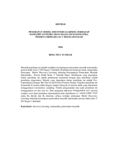 Masalah penelitian ini adalah rendahnya kemampuan pemecahan masalah matematika peserta didik kelas V SD Negeri 1 Sidodadi. Penelitian ini bertujuan untuk mengetahui Penerapan Model Discovery Learning terhadap Kemampuan Pemecahan Masalah Matematika Peserta Didik Kelas V Sekolah Dasar. Pendekatan yang digunakan dalam penelitian ini adalah pendekatan kuantitatif dengan jenis penelitian adalah penelitian eksperimen. Metode yang digunakan dalam penelitian ini adalah Pre- Experimental dengan The One Group Pretest-Posttest Design. Populasi penelitian ini berjumlah 45 peserta didik dengan sampel sebanyak 24 peserta didik yang ditentukan menggunakan convenience sampling. Teknik pengumpulan data pada penelitian ini menggunakan tes dan non tes. Dari pengujian hipotesis menggunakan uji-t (paired sampel t-test) hasil penelitian menunjukkan nilai signifikansi (2- tailed) 0,000 < 0,05 maka Ho ditolak dan Ha diterima, artinya terdapat penerapan Model Discovery Learning terhadap kemampuan pemecahan masalah matematika peserta didik kelas V SD Negeri 1 Sidodadi. Kata kunci: discovery learning, matematika, pemecahan masalah. The problem of this research was the low mathematical problem-solving ability of fifth-grade students at SD Negeri 1 Sidodadi. This study aimed to determine the application of the Discovery Learning model to the mathematical problem-solving ability of fifth-grade elementary school students. The approach used in this research was a quantitative approach with an experimental research type. The method used was Pre-Experimental with the One Group Pretest-Posttest Design. The population of this study consisted of 45 students, and the sample consisted of 24 students determined using convenience sampling. The data collection techniques used in this study were tests and non-tests. Based on hypothesis testing using the t-test (paired sample t-test), the results showed a significance value (2-tailed) of 0.000 < 0.05, thus Ho was rejected and Ha was accepted. This indicated that the application of the Discovery Learning model had a significant effect on the mathematical problem- solving ability of fifth-grade students at SD Negeri 1 Sidodadi. Keywords: discovery learning, mathematics, problem solving.