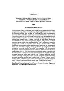 Perkembangan fashion di Indonesia selalu mengalami perubahan karena inovasi yang semakin maju, hal ini menunjukkan penting bagi pelaku usaha untuk selalu peka dengan keadaaan yang ada saat ini. Beberapa faktor yang mempengaruhi konsumen dalam melakukan keputusan pembelian adalah kualitas produk, trend fashion dan content marketing. Penelitian ini bertujuan untuk mengetahui pengaruh kualitas produk, trend fashion dan content marketing terhadap keputusan pembelian produk tapis BunQee Craft n Fashion. Penelitian ini meggunakan pendekatan kuantitatif dengan jenis penelitian explanatory. Populasi pada penelitian ini adalah konsumen pernah melihat akun instagram BunQee Craft n Fashion, dan konsumen yang pernah membeli dan memakai produk BunQee Craft n Fashion. Untuk menentukan pengambilan jumlah responden dalam penelitian ini menggunakan teknik non probability sampling dengan pendekatan yang digunakan adalah pendekatan purposive sampling sebanyak 100 responden. Data dikumpulkan dengan cara menyebarkan kuisioner secara online dan offline kemudian dianalisis menggunakan SPSS 27. Hasil penelitian ini menunjukkan variabel kualitas produk dan trend fashion secara parsial memiliki pengaruh positif dan signifikan terhadap keputusan pembelian produk tapis BunQee Craft n Fashion, sedangkan variabel content marketing secara parsial tidak memiliki pengaruh signifikan terhadap keputusan pembelian produk tapis BunQee Craft n Fashion. Namun variabel kualitas produk, trend fashion, dan content marketing secara simultan berpengaruh positif terhadap keputusan pembelian produk tapis BunQee Craft n Fashion. Kata Kunci: Kualitas Produk, Trend Fashion, Content Marketing, Keputusan Pembelian, Tapis, BunQee Craft n Fashion The development of fashion in Indonesia is constantly evolving due to increasingly advanced innovations. This highlights the importance for business actors to remain responsive to current conditions. One of the factors that influence consumers in making purchasing decisions is product quality, fashion trends, and content marketing. This study aims to determine the influence of product quality, fashion trends, and content marketing on the purchasing decisions of Tapis BunQee Craft n Fashion products. A quantitative approach was used with an explanatory research type. The population of this study includes consumers who have viewed the BunQee Craft n Fashion Instagram account and those who have purchased or used BunQee Craft n Fashion products. The sample size was determined using a non-probability sampling technique, specifically purposive sampling, with a total of 100 respondents. Data was collected through online and offline questionnaires and analyzed using SPSS 27. The results show that the variables of product quality and fashion trends have a partial positive and significant effect on purchasing decisions for Tapis BunQee Craft n Fashion products. However, the content marketing variable does not have a significant partial effect. Nonetheless, product quality, fashion trends, and content marketing simultaneously have a positive influence on purchasing decisions for Tapis BunQee Craft n Fashion products. Keywords: Product Quality, Fashion Trends, Content Marketing, Purchasing Decisions, Tapis, BunQee Craft n Fashion