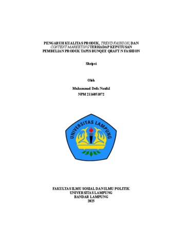 Muhammad , Defa Naufal (2025) PENGARUH KUALITAS PRODUK, TREND FASHION, DAN CONTENT MARKETING TERHADAP KEPUTUSAN PEMBELIAN PRODUK TAPIS BUNQEE QRAFT N FASHION. FAKULTAS ILMU SOSIAL DAN ILMU POLITIK, UNIVERSITAS LAMPUNG.