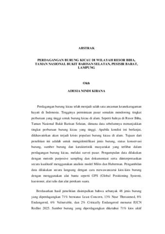 ADESIA , NINDI KIRANA (2025) PERDAGANGAN BURUNG KICAU DI WILAYAH RESOR BIHA, TAMAN NASIONAL BUKIT BARISAN SELATAN, PESISIR BARAT, LAMPUNG. FAKULTAS MATEMATIKA DAN ILMU PENGETAHUAN ALAM, UNIVERSITAS LAMPUNG.