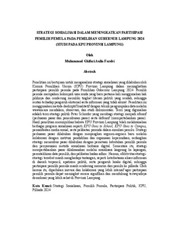 Penelitian ini bertujuan untuk menganalisis strategi sosialisasi yang dilakukan oleh Komisi Pemilihan Umum (KPU) Provinsi Lampung dalam meningkatkan partisipasi pemilih pemula pada Pemilihan Gubernur Lampung 2024. Pemilih pemula merupakan kelompok usia muda yang baru pertama kali menggunakan hak pilihnya dan cenderung memiliki tingkat literasi politik yang rendah, sehingga rentan terhadap pengaruh eksternal serta informasi yang tidak akurat. Penelitian ini menggunakan metode deskriptif kualitatif dengan teknik pengumpulan data melalui wawancara mendalam, observasi, dan studi dokumentasi. Teori yang digunakan adalah teori strategi politik Peter Schroder yang membagi strategi menjadi ofensif (perluasan pasar dan penembusan pasar) serta defensif (mempertahankan pasar). Hasil penelitian menunjukkan bahwa KPU Provinsi Lampung telah melaksanakan berbagai program sosialisasi seperti KPU Goes to School, KPU Goes to Campus, pemanfaatan media sosial, serta pelibatan pemuda dalam simulasi pemilu. Strategi perluasan pasar dilakukan dengan menjangkau segmen-segmen baru melalui kolaborasi dengan institusi pendidikan dan organisasi kepemudaan, sedangkan strategi menembus pasar dilakukan dengan pemetaan kebutuhan pemilih pemula dan penyesuaian metode sosialisasi berbasis digital. Sementara itu, strategi mempertahankan pasar dilaksanakan melalui sosialisasi langsung ke lapangan, pemutakhiran data pemilih, dan pelibatan badan adhoc. Namun, efektivitas strategi- strategi tersebut masih menghadapi tantangan, seperti keterbatasan akses informasi di daerah terpencil, apatisme politik, serta pengaruh hoaks digital, sehingga partisipasi pemilih pemula masih cenderung menurun dari pemilu ke pilkada. Oleh karena itu, diperlukan inovasi dan kolaborasi yang lebih intensif agar partisipasi pemilih pemula dapat meningkat secara signifikan dan mendukung terwujudnya demokrasi yang lebih sehat di Provinsi Lampung. Kata Kunci: Strategi Sosialisasi, Pemilih Pemula, Partisipasi Politik, KPU, Pilkada 2024 This study aims to analyze the socialization strategies implemented by the General Elections Commission (KPU) of Lampung Province to increase first-time voter participation in the 2024 Lampung Gubernatorial Election. First-time voters, who are generally young and casting their votes for the first time, often have low political literacy and are vulnerable to external influences and inaccurate information. This research employs a qualitative descriptive method, utilizing data collection techniques such as in-depth interviews, observation, and documentation studies. The study is based on Peter Schroder’s political strategy theory, which divides strategies into offensive (market expansion and penetration) and defensive (market retention). The findings reveal that the KPU of Lampung Province has implemented various socialization programs, including "KPU Goes to School," "KPU Goes to Campus," the use of social media, and youth involvement in election simulations. Market expansion strategies are carried out by reaching new segments through collaboration with educational institutions and youth organizations, while market penetration strategies involve mapping the needs of first-time voters and adapting digital-based socialization methods. Meanwhile, market retention strategies are implemented through direct field socialization, voter data updating, and the involvement of adhoc bodies. However, the effectiveness of these strategies still faces challenges, such as limited access to information in remote areas, political apathy, and the influence of digital hoaxes, resulting in a declining trend of first-time voter participation from general elections to regional elections. Therefore, more intensive innovation and collaboration are needed to significantly increase first-time voter participation and support the realization of a healthier democracy in Lampung Province. Keywords: Socialization Strategy, First-Time Voters, Political Participation, KPU, 2024 Regional