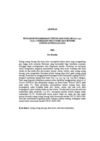 Enting-enting kacang dan daun kelor merupakan bahan alami yang mengandung gizi tinggi serta senyawa fitokimia yang bermanfaat bagi kesehatan manusia, sehingga dapat meningkatkan nilai fungsional produk. Penelitian ini bertujuan untuk mengetahui pengaruh penambahan tepung daun kelor terhadap sifat fisik (kadar air dan kadar abu) dan sensori (aroma, warna, tekstur, rasa) enting-enting kacang, serta mengetahui formulasi terbaik tepung daun kelor pada enting-enting kacang. Penelitian ini menggunakan Rancangan Acak Kelompok Lengkap (RAKL) dengan 6 perlakuan tepung daun kelor (0 g, 1 g, 2 g, 3 g, 4 g, 5 g) dan 3 ulangan. Data yang diperoleh dilakukan analisis secara statistika menggunakan Analysis of Varian (ANOVA) dan dilanjutkan dengan uji Beda Nyata Terkecil (BNT) pada taraf nyata 5%. Hasil penelitian menunjukkan bahwa tepung daun kelor berpengaruh nyata terhadap kadar abu, aroma, warna, dan rasa serta tidak berpengaruh nyata terhadap kadar air dan tekstur. Karakteristik kimia dan aktivitas antioksidan pada perlakuan 1 g (P1), merupakan produk terbaik dengan kadar antioksidan 42,2%. Karakteristik kimia seperti kadar air, kadar abu dan kadar protein formula enting-enting kacang telah memenuhi standar SNI 01-4034-1996. Aktivitas antioksidan tergolong dalam kategori inhibisi sedang, sedangkan kadar lemak belum memenuhi standar SNI 01-4034-1996. Kata kunci: enting-enting kacang, daun kelor, aktivitas antioksidan. Peanut enting-enting and moringa leaves are natural ingredients that contain high nutritional value and phytochemical compounds that are beneficial for human health, thus increasing the functional value of the product. This study aims to determine the effect of adding moringa leaf flour on the physical properties (water content and ash content) and sensory (smell, color, texture, taste) of peanut enting- enting, and to determine the best formulation of moringa leaf flour in enting-enting kacang. This study used a Completely Randomized Block Design (CRBD) with 6 treatments of moringa leaf flour (0 g, 1 g, 2 g, 3 g, 4 g, 5 g) and 3 replications. The data obtained were analyzed statistically using Analysis of Variance (ANOVA) and continued with the Least Significant Difference (LSD) test at a significance level of 5%. The results showed that moringa leaf flour significantly affected the ash content, smell, color, and taste and did not significantly affect the water content and texture. The chemical characteristics and antioxidant activity of the 1 g treatment (P1), were the best product with an antioxidant content of 42.2%. Chemical characteristics such as moisture content, ash content, and protein content of the peanut enting-enting formula have meet the SNI 01-4034-1996 standard. Antioxidant activity is classified as moderate inhibition, while fat content does not meet the SNI 01-4034-1996 standard. Keywords: peanut enting enting, moringa leaves, antioxidant activity.