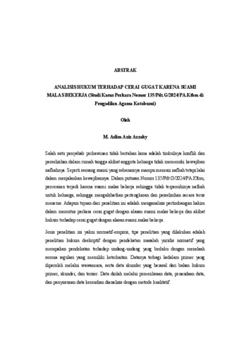 M. Aslim , Aziz Azzaky (2025) ANALISIS HUKUM TERHADAP CERAI GUGAT KARENA SUAMI MALAS BEKERJA (Studi Kasus Perkara Nomor 135/Pdt.G/2024/PA.Ktbm di Pengadilan Agama Kotabumi). FAKULTAS HUKUM, UNIVERSITAS LAMPUNG.