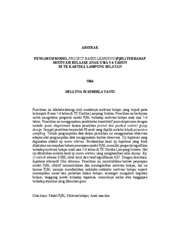 Dellyna , Syafmirla Yanti (2025) PENGARUH MODEL PROJECT BASED LEARNING (PjBL) TERHADAP MOTIVASI BELAJAR ANAK USIA 5-6 TAHUN DI TK KARTIKA LAMPUNG SELATAN. FAKULTAS KEGURUAN DAN ILMU PENDIDIKAN, UNIVERSITAS LAMPUNG .