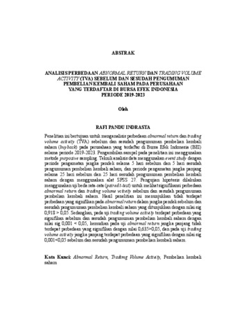 Rafi , Pandu Indrasta (2025) ANALISIS PERBEDAAN ABNORMAL RETURN DAN TRADING VOLUME ACTIVITY (TVA) SEBELUM DAN SESUDAH PENGUMUMAN PEMBELIAN KEMBALI SAHAM PADA PERUSAHAAN YANG TERDAFTAR DI BURSA EFEK INDONESIA PERIODE 2019-2023. FAKULTAS ILMU SOSIAL DAN ILMU POLITIK, UNIVERSITAS LAMPUNG .