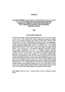 Penelitian ini bertujuan untuk menganalisis perbedaan abnormal return dan trading volume activity (TVA) sebelum dan sesudah pengumuman pembelian kembali saham (buyback) pada perusahaan yang terdaftar di Bursa Efek Indonesia (BEI) selama periode 2019-2023. Pengambilan sampel pada penelitian ini menggunakan metode purposive sampling. Teknik analisis data menggunakan event study dengan periode pengamatan jangka pendek selama 5 hari sebelum dan 5 hari sesudah pengumuman pembelian kembali saham, dan periode pengamatan jangka panjang selama 25 hari sebelum dan 25 hari sesudah pengumuman pembelian kembali saham dengan menggunakan alat SPSS 27. Pengujian hipotesis dilakukan menggunakan uji beda rata-rata (paired t-test) untuk melihat signifikansi perbedaan abnormal return dan trading volume vctivity sebelum dan sesudah pengumuman pembelian kembali saham. Hasil penelitian ini menunjukkan tidak terdapat perbedaan yang signifikan pada abnormal return dalam jangka pendek sebelum dan sesudah pengumuman pembelian kembali saham yang ditunjukkan dengan nilai sig 0,918 > 0,05. Sedangkan, pada uji trading volume activity terdapat perbedaan yang signifikan sebelum dan sesudah pengumuman pembelian kembali saham dengan nilai sig 0,001 < 0,05, kemudian pada uji abnormal return jangka panjang tidak terdapat perbedaan yang signifikan dengan nilai 0,635>0,05, dan pada uji trading volume activity jangka panjang terdapat perbedaan yang signifikan dengan nilai sig 0,001<0,05 sebelum dan sesudah pengumuman pembelian kembali saham. Kata Kunci: Abnormal Return, Tradimg Volume Activity, Pembelian kembali saham This research aims to analyze the differences in abnormal return and trading volume activity (TVA) before and after the announcement of share buybacks in companies listed on the Indonesia Stock Exchange (IDX) during the period 2019- 2023. The sampling method used in this research is purposive sampling. The data analysis technique employs event study with short-term observation periods of 5 days before and 5 days after the share buyback announcement, and long-term observation periods of 25 days before and 25 days after the share buyback announcement using SPSS 27. Hypothesis testing was conducted using paired t-test to examine the significance of differences in abnormal return (AR) and trading volume activity (TVA) before and after buyback. The results of this research show that there is no significant difference in abnormal return in the short term before and after the share buyback announcement, as indicated by a significance value of sig 0.918 > 0.05. Meanwhile, in the trading volume activity test, there is a significant difference before and after the share buyback announcement with a value of sig 0.001 < 0.05. Furthermore, in the long-term abnormal return test, there is no significant difference with a value of sig 0.635 > 0.05, and in the long-term trading volume activity test, there is a significant difference with a value of sig 0.001 < 0.05 before and after the share buyback announcement. Keywords: Abnormal Return, Trading Volume Activity, Share Buyback