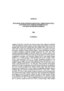 Anggrek Dendrobium memiliki nilai ekonomi yang cukup tinggi dan prospektif untuk dibudidayakan sebagai bunga pot maupun bunga potong. Masa juvenil yang panjang pada Dendrobium menjadi salah satu masalah utama, Oleh karena itu, usaha untuk mempercepat pembungaan pada Dendrobium merupakan hal krusial bagi petani, penghobi, maupun pemulia anggrek. Tujuan dilakukannya penelitian ini adalah mempelajari pengaruh berbagai konsentrasi BA, TDZ, dan KNO3 terhadap pembungaan anggrek Dendrobium hibrida serta melihat interaksi antar kombinasi faktor tersebut. Penelitian terdiri dari dua percobaan. Percobaan pertama menggunakan rancangan acak kelompok lengkap (RAKL) tiga ulangan dengan faktorial (2 x 3). Faktor pertama 2 taraf konsentrasi BA (0 dan 250 ppm). Faktor kedua 3 taraf konsentrasi TDZ (0, 10, 20 ppm). Rancangan percobaan ke dua menggunakan rancangan acak kelompok lengkap (RAKL) pola faktorial (2 x 3) dengan 4 ulangan. Faktor pertama 2 taraf konsentrasi KNO3 (0 dan10 g/l). Faktor kedua 3 taraf konsentrasi BA (0, 150, 300 ppm). Hasil penelitian menunjukkan aplikasi BA250 ppm meningkatkan persentase tanaman berbunga secara signifikan dari 8,3% (kontrol) menjadi 83,3%, dengan kualitas bunga yang tidak berbeda dengan kontrol. Aplikasi TDZ (10 dan 20 ppm) meningkatkan persentase tanaman berbunga dari 8,3% (kontrol) menjadi berturut-turut 91,7% dan 100%. Namun demikian, TDZ baik 10 ppm maupun 20 ppm menurunkan rata-rata panjang malai dan jumlah kuntum bunga. Aplikasi 10 g/l KNO3 tidak mempengaruhi pembungaan pada anggrek Dendrobium hibrida. Aplikasi BA pada 150 ppm maupun 300 ppm secara signifikan meningkatkan persentase berbunga dari 25% (kontrol) menjadi berturut-turut 81,25% dan 75% dan meningkatkan rata-rata jumlah kuntum bunga dari 13 (kontrol) menjadi berturut-turut 26 dan 24 kuntum bunga. Tidak terdapat 2 interaksi antara BA dan TDZ maupun KNO3 dan BA dalam mempengaruhi semua variabel pengamatan. Kata kunci : BA, Dendrobium, pembungaan, TDZ Dendrobium orchids have a relatively high economic value and are prospectively cultivated as potted and cut flowers. However, the long juvenile phase of Dendrobium poses a major challenge. Therefore, accelerating flowering in Dendrobium is crucial for farmers, hobbyists, and breeders. This study aims to examine the effects of various concentrations of BA, TDZ, and KNO3 on the flowering of hybrid Dendrobium orchids and to analyze interactions between these factors. The study consisted of two experiments using a completely randomized block design (CRBD). The first experiment tested BA (0 and 250 ppm) and TDZ (0, 10, 20 ppm) with three replications. The second experiment examined KNO3 (0 and 10 g/L) and BA (0, 150, 300 ppm) with four replications. The results showed that applying BA at 250 ppm significantly increased the flowering percentage from 8,3% (control) to 83,3%, with no difference in flower quality. TDZ (10 and 20 ppm) increased flowering from 8,3% (control) to 91,7% and 100%, respectively, but reduced inflorescence length and flower count. KNO3 at 10 g/L had no effect on flowering. BA at 150 ppm and 300 ppm significantly increased flowering from 25% (control) to 81,25% and 75%, respectively, and increased flower count from 13 (control) to 26 and 24. No interaction was found between BA and TDZ or KNO3 and BA in influencing all observed variables. Keywords: BA, Dendrobium, flowering, TDZ.