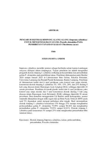 Stefani , Diva Andini (2025) PENGARUH EKSTRAK RIMPANG ALANG-ALANG (Imperata cylindrica) UNTUK MENGENDALIKAN GULMA Praxelis clematidea PADA PEMBIBITAN TANAMAN KAKAO (Theobroma cacao). FAKULTAS PERTANIAN, UNIVERSITAS LAMPUNG .