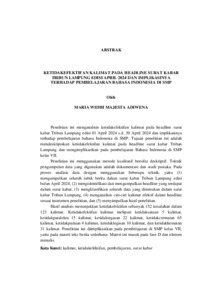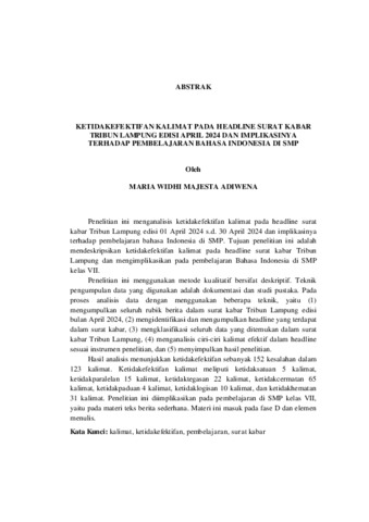 MARIA WIDHI , MAJESTA ADIWENA (2025) KETIDAKEFEKTIFAN KALIMAT PADA HEADLINE SURAT KABAR TRIBUN LAMPUNG EDISI APRIL 2024 DAN IMPLIKASINYA TERHADAP PEMBELAJARAN BAHASA INDONESIA DI SMP. FAKULTAS KEGURUAN DAN ILMU PENDIDIKAN, UNIVERSITAS LAMPUNG.