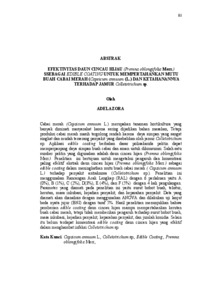 Cabai merah (Capsicum annuum L.) merupakan tanaman hortikultura yang banyak diminati masyarakat karena sering dijadikan bahan masakan, Tetapi produksi cabai merah masih tergolong rendah karena daya simpan yang sangat singkat dan mudah terserang penyakit yang disebabkan oleh jamur Colletotrichum sp. Aplikasi edible coating berbahan dasar polisakarida pektin dapat memperpanjang daya simpan buah cabai dan aman untuk dikonsumsi. Salah satu sumber pektin yang digunakan adalah daun cincau hijau (Premna oblongifolia Merr.). Penelitian ini bertujuan untuk mengetahui pengaruh dan konsentrasi paling efektif ekstrak daun cincau hijau (Premna oblongifolia Merr.) sebagai edible coating dalam meningkatkan mutu buah cabai merah ( Capsicum annuum L.) terhadap penyakit antraknosa (Colletotrichum sp.). Penelitian ini menggunakan Rancangan Acak Lengkap (RAL) dengan 6 perlakuan yaitu A (0%), B (1%), C (2%), D(3%), E (4%), dan F (5%) dengan 4 kali pengulangan. Parameter yang diamati pada penelitian ini yaitu susut bobot buah, tekstur, kerutan, masa inkubasi, kejadian penyakit, dan keparahan penyakit. Data yang diamati akan dianalisis dengan menggunakan ANOVA dan dilakukan uji lanjut beda nyata jujur (BNJ) dengan taraf 5%. Hasil penelitian menunjukkan bahwa pemberian edible coating daun cincau hijau mampu mempertahankan kerutan buah cabai merah, tetapi tidak memberikan pengaruh terhadap susut bobot buah, masa inkubasi, kejadian penyakit, keparahan penyakit, dan jumlah konidia. Selain itu belum terdapat konsentrasi edible coating daun cincau hijau yang efektif dalam menghambat infeksi Colletotrichum sp. Kata Kunci: Capsicum annuum L., Colletotrichum sp., Edible Coating., Premna oblongifolia Merr., Red chili (Capsicum annuum L.) is a horticultural crop that is in great demand by the public because it is often used as a cooking ingredient. However, red chili production is still relatively low due to its very short shelf life and susceptibility to diseases caused by the fungus Colletotrichum sp. The application of edible coating made from pectin polysaccharides can extend the shelf life of chili fruit and is safe for consumption. One of the pectin sources used is green grass jelly leaves (Premna oblongifolia Merr.). This study used a Completely Randomized Design (CRD) with 6 treatments, namely A (0%), B (1%), C (2%), D (3%), E (4%), and F (5%) with 4 replications. The parameters observed in this study were fruit weight loss, texture, wrinkles, incubation period, disease incidence, and disease severity. The observed data will be analyzed using ANOVA and further tests for honestly significant differences (HSD) with a level of 5%. The results showed that the application of green grass jelly leaf edible coating was able to provide an effect in maintaining red chili fruit wrinkles, but did not have an effect on fruit weight loss, incubation period, disease incidence, disease severity, and the number of conidia. In addition, there is no concentration of green grass jelly leaf edible coating that is effective in inhibiting Colletotrichum sp. infection. Keyword: Capsicum annuum L., Colletotrichum sp., Edible Coating., Premna oblongifolia Merr.
