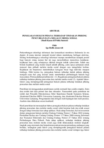 Perkembangan teknologi informasi dan komunikasi membawa Indonesia ke era digital, di mana internet menjadi krusial dalam mendukung berbagai aktivitas. Seiring berkembangnya teknologi informasi mampu memberikan dampak positif bagi banyak orang namun hal ini juga menyebabkan munculnya kejahatan- kejahatan baru yang selanjutnya dikenal dengan istilah cybercrime. Salah satu bentuk kejahatan yang marak terjadi adalah phising, yaitu upaya penipuan untuk mencuri data pribadi melalui media sosial dengan cara mengelabui korban. Kejahatan ini berpotensi menimbulkan kerugian besar bagi individu maupun lembaga. Oleh karena itu, penegakan hukum terhadap tindak pidana phising menjadi suatu hal yang krusial untuk memberikan perlindungan hukum bagi masyarakat. Permasalahan penelitian ini : (1). Bagaimana penegakan hukum pidana terhadap tindakan phising pencurian data melalui media sosial (2). Apakah faktor- faktor yang mempengaruhi penegakan hukum pidana terhadap tindakan phising pencurian data melalui media sosial Penelitian ini menggunakan pendekatan yuridis normatif dan yuridis empiris. Jenis data terdiri dari data primer dan data sekunder. Narasumber pada penelitian ini terdiri dari Penyidik Ditreskrimsus Siber Kepolisian Daerah Sumatera Selatan, Akademisi Fakultas MIPA Universitas Lampung, dan Akademisi Fakultas Hukum Universitas Lampung. Pengumpulan data dengan studi lapangan dan studi pustaka. Analisis data dilakukan secara kualitatif. Hasil penelitian ini menunjukan bahwa penegakan hukum pidana terhadap tindakan phising pencurian data melalui media sosial telah berjalan baik dan telah sesuai dengan tahap formulasi dan tahap aplikasi. Pada tahap formulasi, hal ini tercermin dalam pengaturan hukum melalui Undang-Undang Nomor 1 Tahun 2024 tentang Perubahan Kedua atas Undang-Undang Nomor 11 Tahun 2008 tentang Informasi dan Transaksi Elektronik dan Undang-Undang Nomor 27 Tahun 2022 tentang Perlindungan Data Pribadi. Pada tahap aplikasi, terhadap tindakan phising pencurian data melalui media sosial juga telah dilaksanakan melalui langkah- langkah yang sistematis dan berpedoman pada peraturan perundang-undangan yang berlaku, sedangkan pada faktor yang mempengaruhi penegakan hukum pidana terhadap tindakan phising pencurian data melalui media sosial terdapat tiga faktor Igo Rollis Joosevelt dominan yaitu faktor penegak hukum, sarana dan fasilitas, serta masyarakat. Faktor penegak hukum dipengaruhi oleh keterbatasan kemampuan penyidik siber, terutama dalam aspek teknologi informasi. Hal ini juga berkaitan dengan faktor sarana dan fasilitas, di mana keterbatasan anggaran menghambat pengadaan perangkat forensik dan infrastruktur teknologi yang memadai. Sementara itu, faktor masyarakat turut berperan dalam maraknya kasus phising di media sosial akibat rendahnya pemahaman teknologi, kurangnya kewaspadaan, serta mudahnya masyarakat tergiur oleh modus penipuan yang menjanjikan hadiah atau uang.Selain itu, banyak korban phising yang merasa malu atau enggan melaporkan kasus yang dialaminya karena cenderung menyalahkan diri sendiri atas kelalaian mereka atau khawatir dengan stigma negatif dari lingkungan sekitar dan juga sering menganggap proses pelaporan kejahatan sebagai sesuatu yang sulit, rumit, dan memakan waktu, sehingga menghambat penyidik untuk mempercepat pengungkapan dan penanganan kasus phising. Adapun saran dari penelitian ini adalah perlunya pelatihan dan peningkatan kapasitas bagi penyidik, khususnya personel di bidang siber, agar lebih menguasai teknologi informasi yang terus berkembang. Selain itu, pemerintah dan institusi terkait perlu mengalokasikan anggaran yang memadai untuk pengadaan perangkat keras dan perangkat lunak forensik guna mendukung efektivitas penyidikan. Partisipasi aktif masyarakat juga sangat diperlukan dalam upaya penegakan hukum, masyarakat diharapkan lebih berani untuk melapor, menggunakan teknologi secara bijak, serta memahami aspek hukum dan modus kejahatan yang berkembang. Kata Kunci : Penegakan Hukum Pidana, Tindakan Phising, Pencurian Data, Media Sosial The development of information and communication technology has brought Indonesia into the digital era, where the internet plays a crucial role in supporting various activities. While technological advancements have had a positive impact on many aspects of life, they have also led to the emergence of new crimes, commonly referred to as cybercrime. One of the most prevalent forms of cybercrime is phising, a fraudulent attempt to steal personal data through social media by deceiving victims. This crime has the potential to cause significant losses for individuals and institutions alike. Therefore, criminal law enforcement against phising crimes is crucial to providing legal protection to society. This research addresses the following issues: (1) How is criminal law enforcement carried out against phising data theft through social media? (2) What factors influence the enforcement of criminal law against phising data theft through social media? This study employs a normative juridical and empirical juridical approach. The data consists of primary and secondary data. The research respondents include investigators from the Cyber Crime Unit of the South Sumatra Regional Police, an academic from the Faculty of Mathematics and Natural Sciences at the University of Lampung, and an academic from the Faculty of Law at the University of Lampung. Data collection methods include field studies and literature studies, while data analysis is conducted qualitatively. The findings of this study indicate that criminal law enforcement against phising data theft through social media has been effectively implemented, aligning with both the formulation and application stages. In the formulation stage, this is reflected in legal regulations such as Law Number 1 of 2024 concerning the Second Amendment to Law Number 11 of 2008 on Electronic Information and Transactions, as well as Law Number 27 of 2022 on Personal Data Protection. In the application 