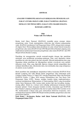 Wulan Asih , Trie Sefiarni (2025) ANALISIS YURIDIS PELAKSANAAN KERJASAMA PENGELOLAAN ZAKAT ANTARA BADAN AMIL ZAKAT NASIONAL (BAZNAS) DENGAN UNIT PENGUMPUL ZAKAT (UPZ) MASJID DI KOTA BANDAR LAMPUNG. FAKULTAS HUKUM, UNIVERISTAS LAMPUNG.
