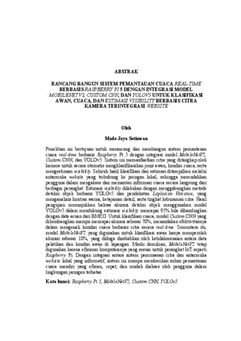 Penelitian ini bertujuan untuk merancang dan membangun sistem pemantauan cuaca real-time berbasis Raspberry Pi 5 dengan integrasi model MobileNetV2, Custom CNN, dan YOLOv5. Sistem ini memanfaatkan citra yang ditangkap oleh kamera untuk secara otomatis mengklasifikasikan jenis awan, kondisi cuaca, serta mengestimasi visibility. Seluruh hasil klasifikasi dan estimasi ditampilkan melalui antarmuka website yang terhubung ke jaringan lokal, sehingga memudahkan pengguna dalam mengakses dan memantau informasi cuaca secara langsung dari berbagai perangkat. Estimasi visibility dilakukan dengan menggabungkan metode deteksi objek berbasis YOLOv5 dan pendekatan Laplacian Variance, yang menganalisis kontras warna, ketajaman detail, serta tingkat keburaman citra. Hasil pengujian menunjukkan bahwa akurasi deteksi objek menggunakan model YOLOv5 dalam mendukung estimasi visibility mencapai 95% bila dibandingkan dengan data acuan dari BMKG. Untuk klasifikasi cuaca, model Custom CNN yang dikembangkan mampu mencapai akurasi sebesar 70%, menandakan efektivitasnya dalam mengenali kondisi cuaca berbasis citra secara real-time. Sementara itu, model MobileNetV2 yang digunakan untuk klasifikasi awan hanya memperoleh akurasi sebesar 10%, yang diduga disebabkan oleh ketidaksesuaian antara data pelatihan dan kondisi awan di lapangan. Meski demikian, MobileNetV2 tetap digunakan karena efisiensi komputasinya yang sesuai untuk perangkat IoT seperti Raspberry Pi. Dengan integrasi antara sistem pemrosesan citra dan antarmuka website lokal yang informatif, sistem ini mampu memberikan solusi pemantauan cuaca mandiri yang efisien, cepat, dan mudah diakses oleh pengguna dalam lingkungan jaringan terbatas. Kata kunci: Raspberry Pi 5, MobileNetV2, Custom CNN, YOLOv5. This study aims to design and develop a real-time weather monitoring system based on the Raspberry Pi 5, integrating MobileNetV2, a Custom CNN, and YOLOv5 models. The system utilizes images captured by a camera to automatically classify cloud types, weather conditions, and estimate visibility. All classification and estimation results are displayed through a web-based interface connected to a local network, enabling users to conveniently access and monitor weather information directly from various devices. Visibility estimation is performed by combining object detection using YOLOv5 and the Laplacian Variance approach, which analyzes color contrast, detail sharpness, and image blurriness. Experimental results show that the object detection model YOLOv5 achieved an accuracy of 95% in supporting visibility estimation when compared with reference data from BMKG (Indonesian Meteorological Agency). For weather classification, the developed Custom CNN model reached an accuracy of 70%, indicating its effectiveness in recognizing weather conditions from images in real-time. Meanwhile, the MobileNetV2 model used for cloud classification achieved only 10% accuracy, presumably due to a mismatch between the training dataset and actual cloud conditions in the field. Nevertheless, MobileNetV2 is still employed due to its computational efficiency, which suits implementation on IoT devices such as the Raspberry Pi. With the integration of image processing and an informative local web interface, this system offers an efficient, fast, and accessible standalone weather monitoring solution for environments with limited network connectivity. Keywords: Raspberry Pi 5, MobileNetV2, Custom CNN, YOLOv5.