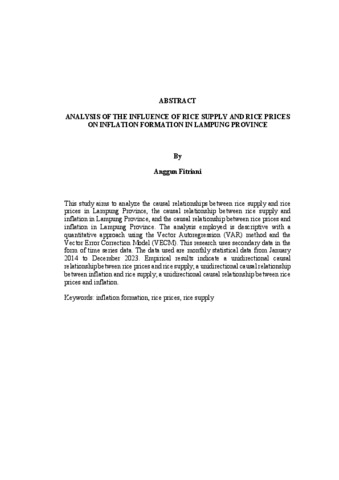 Penelitian ini bertujuan untuk menganalisis hubungan kausalitas antara jumlah persediaan beras dan harga beras di Provinsi Lampung, hubungan kausalitas antara jumlah persediaan beras dan inflasi di Provinsi Lampung, dan hubungan kausalitas antara harga beras dan inflasi di Provinsi Lampung. Analisis yang digunakan yaitu deskriptif dengan pendekatan kuantitatif menggunakan metode Vector Autoregression (VAR) dan Vector Error Correction Model (VECM). Penelitian ini menggunakan data sekunder dalam bentuk time series. Data yang digunakan adalah data statistik bulanan kurun waktu Januari 2014 sampai Desember 2023. Hasil empiris menunjukkan terdapat hubungan kausalitas searah antara harga beras dengan persediaan beras, terdapat hubungan kausalitas searah antara inflasi dengan persediaan beras, terdapat hubungan kausalitas searah antara harga beras dengan inflasi. Kata kunci: harga beras, pembentukan inflasi, persediaan beras This study aims to analyze the causal relationships between rice supply and rice prices in Lampung Province, the causal relationship between rice supply and inflation in Lampung Province, and the causal relationship between rice prices and inflation in Lampung Province. The analysis employed is descriptive with a quantitative approach using the Vector Autoregression (VAR) method and the Vector Error Correction Model (VECM). This research uses secondary data in the form of time series data. The data used are monthly statistical data from January 2014 to December 2023. Empirical results indicate a unidirectional causal relationship between rice prices and rice supply; a unidirectional causal relationship between inflation and rice supply; a unidirectional causal relationship between rice prices and inflation. Keywords: inflation formation, rice prices, rice supply
