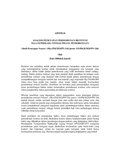 Restitusi atas terjadinya tindak pidana pemerkosaan merupakan suatu proses hukum yang memungkinkan korban untuk mendapatkan penggantian atas kerugian yang dideritanya akibat tindak pidana pemerkosaan yang telah disebutkan dalam undang- undang. Dalam perkara restitusi yang akan menjadi objek penelitian ini terdapat suatu permohonan restitusi yang diajukan oleh korban tindak pidana pemerkosaan dengan memperhitungkan kerugian materiil dan non-materiil yang berjumlah Rp.550.000.000 (lima ratus lima puluh juta rupiah). Akan tetapi, hakim menolak keseluruhan permohonan retitusi tersebut. Penelitian ini berfokus pada permasalahan mengenai dasar pertimbangan hakim dalam menetapkan permohonan restitusi serta mencari faktor penghambat dalam pemenuhan permohonan restitusi. Metode penelitian yang digunakan dalam menganalisis suatu penetapan perkara permohonan restitusi Nomor: 1/Res.Pid/2024/PN Gdt juncto 141/Pid.B/2024/PN Gdt adalah metode yuridis normatif dengan jenis data terdiri dari data primer serta data sekunder. Selain itu penulis juga menganalisis literatur dan studi kasus untuk memahami secara komprehensif mengenai bagaimana dasar pertimbangan hakim dalam memutus suatu permohonan restitusi sebagai bentuk pemulihan hak serta perlindungan hukum terhadap setiap masyarakat. Hasil penelitian ini menunjukan bahwa dasar pertimbangan hakim atas perkara permohonan restitusi ini tidak dikabulkan karena adanya ketidaksesuaian antara barang bukti yang dihadirkan dalam persidangan dengan petitum yang dimintakan oleh korban. Berdasarkan Yurisprudensi Mahkamah Agung Nomor 459.K/SIP/1975 mengenai permohonan ganti kerugian dapat dikabulkan berdasarkan pada bukti-bukti yang konkrit dan terperinci, selain itu tuntutan ganti kerugian tidak boleh hanya berdasarkan perkiraan saja. Hal ini menjadi masalah ataupun penghambat yang timbul 3 Hani Miftahul Jannah dalam implementasi untuk mendapatkan hak restitusi bagi korban tindak pidana pemerkosaan. Hambatan serta masalah tersebut tidak hanya mengenai aturan yang berlakunya saja, akan tetapi juga mengenai lembaga serta aparat penegak hukum yang diberi kewenangan untuk membantu atas pemenuhan hak restitusi korban atau pemohon. Saran dalam penelitian ini yakni mengenai implikasi sosial dari penetapan pengadilan terkait restitusi tindak pidana pemerkosaan ini haruslah berfokus dalam memastikan terpenuhinya rasa keadilan bagi korban pemerkosaan tersebut. Pentingnya bagi aparat penegak hukum untuk dapat memberikan pemahaman mengenai adanya aturan yang dapat dimintakan oleh setiap masyarakat yang menjadi korban tindak pidana sebagai bentuk pemulihan hak serta perlindungan hukum korban. Kata Kunci : Restitusi, Korban Tindak Pidana, Pemerkosaan. Restitution for the occurrence of rape is a legal process that allows victims to obtain compensation for the losses suffered due to the crime of rape as stated in the law. In the restitution case that will be the object of this research, there is a restitution application submitted by the victim of the crime of rape by taking into account material and non- material losses amounting to IDR 550,000,000 (five hundred and fifty million rupiah). However, the judge rejected the entire restitution application. This study focuses on the problem regarding the basis for the judge's considerations in determining the restitution application and finding inhibiting factors in fulfilling the restitution application. The research method used in analyzing the determination of restitution application cases Number: 1/Res.Pid/2024/PN Gdt juncto 141/Pid.B/2024/PN Gdt is a normative juridical method with data types consisting of primary data and secondary data. Apart from that, the author also analyzes literature and case studies to comprehensively understand the basic considerations of judges in deciding on a request for restitution for a victim of a crime of rape as a form of restoration of rights and legal protection for every community. The results of this study indicate that the judge's consideration of the restitution request case was not granted because there was a discrepancy between the evidence presented in court and the petitum requested by the victim. Based on the Supreme Court Jurisprudence Number 459.K/SIP/1975 concerning the request for compensation, it can be granted based on concrete and detailed evidence, in addition, the claim for compensation should not only be based on estimates. This is a problem or obstacle that arises in the implementation of obtaining restitution rights for victims of rape. These obstacles and problems are not only related to the applicable regulations, but also to the institutions and law enforcement officers who are authorized to assist in fulfilling the restitution rights of victims or applicants. 5 Hani Miftahul Jannah The suggestion in this study, namely regarding the social implications of the court's decision regarding restitution for rape, must focus on ensuring that a sense of justice is fulfilled for the rape victim. It is important for law enforcement officers to be able to provide an understanding of the existence of rules that can be requested by every member of society who is a victim of a crime as a form of restoration of rights and legal protection for victims. Keywords: Restitution, Crime Victims, Rape.