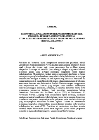 Aristi , Ashridewanti (2025) RESPONSIVITAS PELAYANAN PUBLIK OMBUDSMAN REPUBLIK INDONESIA PERWAKILAN PROVINSI LAMPUNG: STUDI KASUS EFISIENSI DAN AKURASI PROSES PENERIMAAN DAN VERIFIKASI LAPORAN. FAKULTAS ILMU SOSIAL DAN ILMU POLITIK, UNIVERSITAS LAMPUNG.