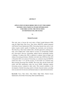 Ilmiatul , Karomah (2025) APPLICATION OF HIGH ORDER CHEN FUZZY TIME SERIES METHOD USING PARTICLE SWARM OPTIMIZATION FOR FORECASTING THE STOCK INDEX OF INDONESIAN ISLAMIC BANKS. FAKULTAS MATEMATIKA DAN ILMU PENGETAHUAN ALAM, UNIVERISTAS LAMPUNG.