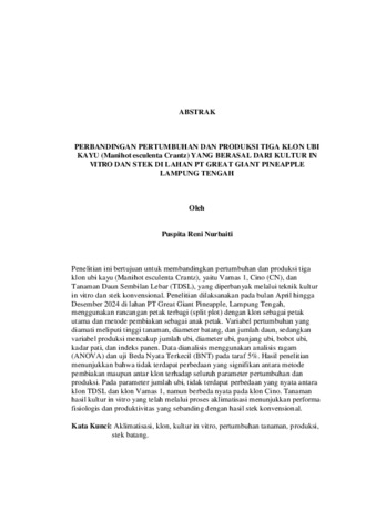 Puspita , Reni Nurbaiti (2025) PERBANDINGAN PERTUMBUHAN DAN PRODUKSI TIGA KLON UBI KAYU (Manihot esculenta Crantz) YANG BERASAL DARI KULTUR IN VITRO DAN STEK DI LAHAN PT GREAT GIANT PINEAPPLE LAMPUNG TENGAH. FAKULTAS PERTANIAN, UNIVERSITAS LAMPUNG.