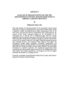 Penelitian ini menganalisis potensi demand konsep aerotropolis di sekitar Bandara Radin Inten II, Provinsi Lampung, khususnya di Kecamatan Natar. Dengan metode kualitatif yang melibatkan studi dokumentasi, kuesioner terhadap 101 responden pengguna pesawat, dan wawancara dengan enam perwakilan instansi terkait, penelitian ini mengungkapkan dukungan kuat masyarakat terhadap pengembangan kawasan aerotropolis. Sebanyak 97% responden menyatakan setuju dengan konsep ini, didukung oleh fakta bahwa 40% responden sering menggunakan pesawat terbang dan frekuensi perjalanan mencapai 43% sekali sebulan. Permasalahan transportasi publik di Kota Bandar Lampung dan kebutuhan akan konektivitas yang lebih baik menjadi alasan utama dukungan tersebut. Dokumen perencanaan wilayah Provinsi Lampung dan Kabupaten Lampung Selatan turut mendukung pengembangan kawasan ini melalui integrasi tata ruang, transportasi multimoda, dan peningkatan fasilitas bandara menjadi internasional. Deliniasi wilayah aerotropolis mencakup kawasan dengan zonasi ketat sesuai standar keselamatan penerbangan. Pengembangan aerotropolis diharapkan dapat membuka lapangan kerja baru, meningkatkan pertumbuhan ekonomi, dan memperkuat konektivitas wilayah. Hasil ini menunjukkan bahwa Kecamatan Natar memiliki potensi strategis sebagai kawasan aerotropolis yang dapat mendukung pembangunan berkelanjutan di Provinsi Lampung.. Kata Kunci: Aerotropolis, Potensi Demand, Bandara Radin Inten II, Kecamatan Natar, Pengembangan Wilayah, Perencanaan Tata Ruang. abstract This study analyzes the demand potential for the aerotropolis concept around Radin Inten II Airport in Lampung Province, specifically in Natar District. Using a qualitative method involving document studies, questionnaires with 101 air travel users, and interviews with six representatives from related agencies, the research reveals strong community support for the development of the aerotropolis area. A total of 97% of respondents agree with this concept, supported by the fact that 40% often use air travel and 43% travel once a month. Issues with public transportation in Bandar Lampung City and the need for better connectivity are primary reasons for this support. Regional planning documents from Lampung Province and Lampung Selatan Regency also support the development through spatial integration, multimodal transportation, and upgrading the airport to international status. The aerotropolis delineation includes areas with strict zoning according to aviation safety standards. The aerotropolis development is expected to generate new employment opportunities, boost economic growth, and strengthen regional connectivity. The findings indicate that Natar District has strategic potential as an aerotropolis area that can support sustainable development in Lampung Province. Keywords: Aerotropolis, Demand Potential, Radin Inten II Airport, Natar District, Regional Development, Spatial Planning.