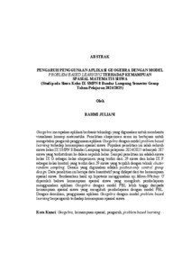 Geogebra merupakan aplikasi berbasis teknologi yang digunakan untuk membantu visualisasi konsep matematika. Penelitian eksperimen semu ini bertujuan untuk mengetahui pengaruh penggunaan aplikasi Goegebra dengan model problem based learning terhadap kemampuan spasial siswa. Populasi penelitian ini ialah seluruh siswa kelas IX SMPN 8 Bandar Lampung tahun pelajaran 2024/2025 sebanyak 287 siswa yang terdistribusi ke dalam sepuluh kelas. Sampel penelitian ini adalah siswa kelas IX G sebagai kelas eksperimen yang terdiri dari 29 siswa dan kelas IX F sebagai kelas kontrol yang terdiri dari 29 siswa yang terpilih dengan teknik cluster random sampling. Desain yang digunakan adalah posttest-only control group design. Data penelitian ini berupa data kuantitatif yang didapat dari tes kemampuan spasial siswa. Berdasarkan hasil uji hipotesis menggunakan uji Mann-Whitney U diperoleh bahwa kemampuan spasial siswa yang mengikuti pembelajaran menggunakan aplikasi Geogebra dengan model PBL lebih tinggi daripada kemampuan spasial siswa yang mengikuti pembelajaran dengan model PBL. Dengan demikian, penggunaan aplikasi Geogebra dengan model problem based learning berpengaruh terhadap kemampuan spasial siswa. Kata Kunci: Geogebra, kemampuan spasial, pengaruh, problem based learning Geogebra is a technology-based application used to visualize mathematical concept dynamics. This quasi-experimental research aimed to determine the effect of using the Geogebra application with the Problem Based Learning model on students' mathematical spatial skills. The population in this research consists of all ninth-grade students of SMPN 8 Bandar Lampung in the 2024/2025 academic year totaling 287 students distributed across ten classes. The sample in this research includes class IX G as the experimental class with 29 students and class IX F as the control class with 29 students selected using purposive sampling technique. The design used is the posttest-only control group design. The data in this research is quantitative data obtained through a spatial skills test. Based on the result of hypothesis test using Mann Whitney U, it was found that student’s mathematical skills who participated in learning using the Geogebra application with the PBL model was higher the student’s mathematical spatial skills of students who participated learning just use Problem Based Learning model without Geogebra application. Thus, using the Geogebra application influences students' mathematical spatial skills. Keywords: effect, geogebra, problem based learning, spatial skills