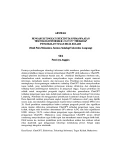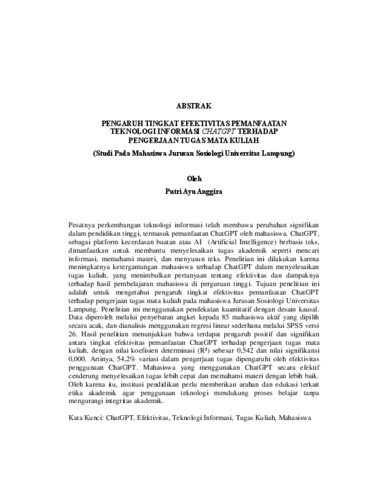 Pesatnya perkembangan teknologi informasi telah membawa perubahan signifikan dalam pendidikan tinggi, termasuk pemanfaatan ChatGPT oleh mahasiswa. ChatGPT, sebagai platform kecerdasan buatan atau AI (Artificial Intelligence) berbasis teks, dimanfaatkan untuk membantu menyelesaikan tugas akademik seperti mencari informasi, memahami materi, dan menyusun teks. Penelitian ini dilakukan karena meningkatnya ketergantungan mahasiswa terhadap ChatGPT dalam menyelesaikan tugas kuliah, yang menimbulkan pertanyaan tentang efektivitas dan dampaknya terhadap hasil pembelajaran mahasiswa di perguruan tinggi. Tujuan penelitian ini adalah untuk mengetahui pengaruh tingkat efektivitas pemanfaatan ChatGPT terhadap pengerjaan tugas mata kuliah pada mahasiswa Jurusan Sosiologi Universitas Lampung. Penelitian ini menggunakan pendekatan kuantitatif dengan desain kausal. Data diperoleh melalui penyebaran angket kepada 85 mahasiswa aktif yang dipilih secara acak, dan dianalisis menggunakan regresi linear sederhana melalui SPSS versi 26. Hasil penelitian menunjukkan bahwa terdapat pengaruh positif dan signifikan antara tingkat efektivitas pemanfaatan ChatGPT terhadap pengerjaan tugas mata kuliah, dengan nilai koefisien determinasi (R2) sebesar 0,542 dan nilai signifikansi 0,000. Artinya, 54,2% variasi dalam pengerjaan tugas dipengaruhi oleh efektivitas penggunaan ChatGPT. Mahasiswa yang menggunakan ChatGPT secara efektif cenderung menyelesaikan tugas lebih cepat dan memahami materi dengan lebih baik. Oleh karena itu, institusi pendidikan perlu memberikan arahan dan edukasi terkait etika akademik agar penggunaan teknologi mendukung proses belajar tanpa mengurangi integritas akademik. Kata Kunci: ChatGPT, Efektivitas, Teknologi Informasi, Tugas Kuliah, Mahasiswa The rapid advancement of information technology has brought significant changes to higher education, including the utilization of ChatGPT by students. ChatGPT, as a text- based artificial intelligence (AI) platform, is used to assist in completing academic tasks such as searching for information, understanding materials, and composing texts. This research was conducted due to the increasing dependence of students on ChatGPT in completing their coursework, raising questions about its effectiveness and its impact on student learning outcomes in higher education. The aim of this study is to determine the influence of the effectiveness level of ChatGPT utilization on coursework completion among students of the Sociology Department at the University of Lampung. This study employs a quantitative approach with a causal design. Data were obtained through the distribution of questionnaires to 85 randomly selected active students and analyzed using simple linear regression with SPSS version 26. The results show a positive and significant influence between the effectiveness of ChatGPT utilization and coursework completion, with a coefficient of determination (R2) of 0.421 and a significance value of 0.000. This means that 42.1% of the variation in coursework completion is influenced by the effectiveness of ChatGPT use. Students who use ChatGPT effectively tend to complete assignments more quickly and better understand the material. Therefore, educational institutions need to provide guidance and education related to academic ethics so that the use of technology supports the learning process without diminishing academic integrity. Keywords: ChatGPT, Effectiveness, Information Technology, Coursework, Students