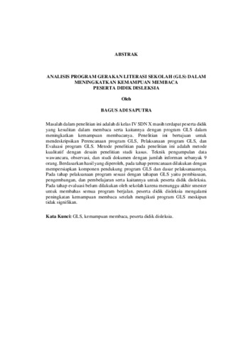 Bagus , Adi Saputra (2025) ANALISIS PROGRAM GERAKAN LITERASI SEKOLAH (GLS) DALAM MENINGKATKAN KEMAMPUAN MEMBACA PESERTA DIDIK DISLEKSIA. FAKULTAS KEGURUAN DAN ILMU PENDIDIKAN, UNIVERSITAS LAMPUNG.