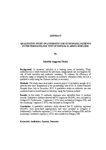 Background: In neonates, infection is a leading cause of mortality. While antibiotics are a viable treatment for infections, inappropriate use can heighten the risk of both mortality and antibiotic resistance. To enhance the efficiency of antibiotic usage in hospitals for neonates, an antibiotic utilization study, such as a qualitative study using the Gyssens method, is necessary. Methods: The study was a descriptive research project. It included a sample of 21 patients who were hospitalized in the perinatology unit of Dr. H. Abdul Moeloek Hospital from July to December 2023. A qualitative study on antibiotic use was conducted and reviewed based on literature using the Gyssens method. Results: In this study, 95 antibiotic regimens were identified from 21 medical records. Qualitative analysis showed that 92 regimens (96.84%) were included in Category 0. Furthermore, 2 regimens (2.11%) were included in Category IIIB, and the remaining 1 regimen (1.05%) was included in Category IIB. Conclusion: A qualitative antibiotic study showed that 92 antibiotic regimens (96.84%) were prescribed appropriately and were included in Category 0. Additionally, 2 antibiotic regimens (2.11%) were included in Category IIIB, and the remaining 1 antibiotic regimen (1.05%) was included in Category IIB. Keywords: Antibiotics, Gyssens, Neonates. Latar Belakang : Pada neonatus, infeksi adalah salah satu faktor penyebab utama kematian. Terapi yang dapat diberikan dalam mengobati infeksi adalah antibiotik. Pengunaan antibiotik tidak tepat dapat menjadi faktor yang dapat meningkatkan risiko kematian dan resistensi. Pada neonatus, untuk meningkatkan efisiensi penggunaan antibiotik di rumah sakit diperlukan adanya studi penggunaan antibiotik salah satunya adalah studi kualitatif dengan metode Gyssens. Metode : Penelitian adalah penelitian deskriptif dengan sampel yang terdiri dari 21 pasien yang dirawat di unit perinatologi RSUD Dr. H.Abdul Moeloek pada Juli - Desember 2023. Studi kualitatif penggunaan antibiotik dilakukan serta dikaji berdasarkan literatur menggunakan metode Gyssens. Hasil : Pada penelitian ini terdapat 95 regimen antibiotik dari 21 rekam medik. Dari hasil studi kualitatif didapati hasil sebanyak 92 regimen antibiotik (96,84%) masuk dalam kategori 0. Sebanyak 2 regimen antibiotik (2,11%) masuk dalam kategori IIIB dan 1 regimen antibiotik lainnya (1,05%) yang termasuk kategori IIB. Kesimpulan : Studi kualitatif antibiotik menunjukan 92 regimen antibiotik (96,84%) diresepkan secara tepat dan masuk dalam kategori 0, sebanyak 2 regimen antibiotik (2,11%) masuk dalam kategori IIIB dan 1 regimen antibiotik lainnya (1,05%) masuk dalam kategori IIB. Kata Kunci : Antibiotik, Gyssens, Neonatus