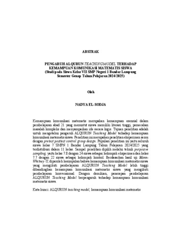 Nadya , El-Sodja (2025) PENGARUH ALQURUN TEACHING MODEL TERHADAP KEMAMPUAN KOMUNIKASI MATEMATIS SISWA (Studi pada Siswa Kelas VII SMP Negeri 1 Bandar Lampung Semester Genap Tahun Pelajaran 2024/2025). FAKULTAS KEGURUAN DAN ILMU PENDIDIKAN , UNIVERSITAS LAMPUNG.