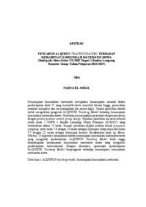 Kemampuan komunikasi matematis merupakan kemampuan esensial dalam pembelajaran abad 21 yang menuntut siswa memiliki literasi tinggi, pemecahan masalah kompleks dan menyampaikan ide secara logis. Tujuan penelitian adalah untuk mengetahui pengaruh ALQURUN Teaching Model terhadap kemampuan komunikasi matematis siswa. Penelitian ini merupakan penelitian eksperimen semu dengan pretest posttest control group design. Populasi penelitian ini yaitu seluruh siswa kelas 7 SMPN 1 Bandar Lampung Tahun Pelajaran 2024/2025 yang terdistribusi dalam 11 kelas. Sampel penelitian dipilih melalui teknik purposive sampling, yaitu kelas 7.8 dengan 24 siswa sebagai kelompok eksperimen dan kelas 7.7 dengan 22 siswa sebagai kelompok kontrol. Berdasarkan hasil uji Mann- Whitney U, diperoleh kesimpulan bahwa kemampuan komunikasi matematis siswa yang mengikuti pembelajaran ALQURUN Teaching Model lebih tinggi dibandingkan kemampuan komunikasi matematis siswa yang mengikuti pembelajaran konvensional. Dengan demikian, penerapan pembelajaran ALQURUN Teaching Model berpengaruh terhadap kemampuan komunikasi matematis siswa. Kata kunci: ALQURUN teaching model, kemampuan komunikasi matematis Mathematical communication skills is an essential ability in 21st -century learning that requires students to have high literacy, complex problem solving and convey ideas logically. The purpose of the study was to determine the effect of ALQURUN Teaching Model on students' mathematical communication skills. This research was quasi experiment research with pretest posttest control group design. The population in this study was all 7th grade students of SMPN 1 Bandar Lampung in the academic year of 2024/2025 which were distributed in 11 classes. The research sample was selected through purposive sampling technique, namely class 7.8 with 24 students as the experimental group and 7.7 with 22 students as the control group. Based on the results of the Mann-Whitney U test, it is concluded that the mathematical communication skills of students who received ALQURUN Teaching Model learning are higher than the mathematical communication skills of students who received conventional learning. Thus, the implementation of ALQURUN Teaching Model learning has an effect on students' mathematical communication skills. Keywords: ALQURUN teaching model, mathematical communication skills