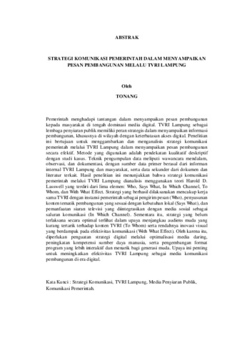 Tonang , - (2025) STRATEGI KOMUNIKASI PEMERINTAH DALAM MENYAMPAIKAN PESAN PEMBANGUNAN MELALUI TVRI LAMPUNG. FAKULTAS ILMU SOSIAL DAN ILMU POLITIK, UNIVERSITAS LAMPUNG.