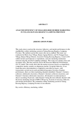 This study aims to analyze the structure, behavior, and market performance in the smallholders rubber marketing system in Tulang Bawang Regency, Lampung Province. The method used in this study is the survey method. The study was conducted in Moris Jaya Village, Banjar Agung District, and Tri Tunggal Jaya Village, Banjar Margo District, located in Tulang Bawang Regency. A total of 50 rubber farmers participated as respondents, and also marketing institutions selected using the snowball sampling technique. This study uses primary data and secondary data. The data analysis used is the Structure-Behavior-Performance (S-C-P) model. The results show that the market structure faced is an imperfectly competitive market, namely an oligopsony market. In market behavior, it was found that price determination is completely controlled by buyers, with transactions carried out in cash and deferred payment. In terms of market performance, there are three marketing channels identified: Channel 1 (farmers- collectors-wholesalers-factories), Channel 2 (farmers-collectors-factories), and Channel 3 (farmers-wholesalers-factories). All channels recorded producer shares exceeding 50 percent, with Channel 3 being the most efficient channel with the lowest marketing margin of IDR 4,700 per kg. In terms of structure, behavior, and market performance, the community rubber marketing system in Tulang Bawang Regency, Lampung Province is not efficient. Key words: efficiency, marketing, rubber Penelitian ini bertujuan untuk menganalisis struktur, perilaku, dan keragaan pasar dalam sistem pemasaran karet rakyat di Kabupaten Tulang Bawang Provinsi Lampung. Metode yang digunakan pada penelitian ini adalah metode survei. Penelitian dilakukan di Desa Moris Jaya, Kecamatan Banjar Agung, dan Desa Tri Tunggal Jaya, Kecamatan Banjar Margo, yang terletak di Kabupaten Tulang Bawang. Sebanyak 50 petani karet berpartisipasi sebagai responden, dan juga lembaga pemasaran yang dipilih dengan menggunakan teknik snowball sampling. Penelitian ini menggunakan data primer dan data sekunder. Analisis data yang digunakan adalah model Struktur-Perilaku-Kinerja (S-C-P). Hasil menunjukkan bahwa struktur pasar yang dihadapi adalah pasar tidak bersaing sempurna yaitu pasar oligopsoni. Dalam perilaku pasar, ditemukan bahwa penentuan harga sepenuhnya dikendalikan oleh pembeli, dengan transaksi dilakukan secara tunai dan tunda bayar. Dari sisi keragaan pasarnya, terdapat tiga saluran pemasaran yang diidentifikasi: Saluran 1 (petani-pedagang pengumpul-pedagang besar- pabrik), Saluran 2 (petani-pedagang pengumpul-pabrik), dan Saluran 3 (petani- pedagang besar-pabrik). Semua saluran mencatat pangsa produsen melebihi 50 persen, dengan Saluran 3 merupakan saluran yang paling efisien dengan marjin pemasaran terendah sebesar Rp4.700 per kg. Dilihat dari sisi struktur, perilaku, dan keragaan pasarnya, sistem pemasaran karet rakyat di Kabupaten Tulang Bawang Provinsi Lampung tidak efisien. Kata kunci: efisiensi, karet, pemasaran