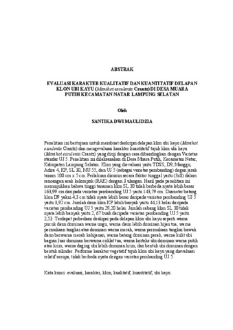 Santika , Dwi Maulidzia (2025) EVALUASI KARAKTER KUALITATIF DAN KUANTITATIF DELAPAN KLON UBI KAYU (Manihot esculenta Crantz) DI DESA MUARA PUTIH KECAMATAN NATAR LAMPUNG SELATAN. FAKULTAS PERTANIAN, UNIVERSITAS LAMPUNG.