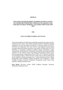 Tujuan dari penelitian ini adalah untuk mengetahui pengaruh dari gender diversity, kompensasi bonus saham, dan keahlian keuangan komisaris independen terhadap manajemen laba pada perusahaan manufaktur di Indonesia periode 2018-2022. Penelitian ini menggunakan jenis data sekunder yang diperoleh melalui laporan keuangan tahunan perusahaan manufaktur yang terdaftar di BEI periode 2018-2022. Penelitian ini merupakan penelitian kuantitatif dengan pengambilan sampel menggunakan metode purposive sampling dan memperoleh data sampel penelitian sebanyak 135 data. Metode analisis yang dilakukan menggunakan analisis regresi linier berganda dengan menggunakan software SPSS versi 27. Hasil dari penelitian ini menunjukkan bahwa variabel Diversitas Gender Dewan Direksi berpengaruh positif signifikan terhadap manajemen laba. Variabel Kompensasi Bonus Saham berpengaruh negatif signifikan terhadap manajemen laba. Sedangkan, variabel Keahlian Keuangan Komisaris Independen berpengaruh positif namun tidak signifikan terhadap manajemen laba. Kata Kunci: Diversitas Gender, ESOP, Keahlian Keuangan, Komisaris Independen, Manajemen Laba. The purpose of this study was to determine the effect of gender diversity, stock bonus compensation, and financial expertise of independent commissioners on earnings management in manufacturing companies in Indonesia for the period 2018-2022. This study uses secondary data obtained through the annual financial reports of manufacturing companies listed on the IDX for the period 2018-2022. This study is a quantitative study with sampling using the purposive sampling method and obtaining 135 research sample data. The analysis method used multiple linear regression analysis using SPSS software version 27. The results of this study indicate that the Board of Directors Gender Diversity variable has a significant positive effect on earnings management. The Stock Bonus Compensation variable has a significant negative effect on earnings management. Meanwhile, the Independent Commissioner Financial Expertise variable has a positive but insignificant effect on earnings management. Keywords: Gender Diversity, ESOP, Financial Expertise, Independent Commissioners, Earnings Management.