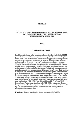 Penelitian ini bertujuan untuk mendeskripsikan keefektifan Model PjBL-STEM pembuatan biogas dari kotoran sapi dalam meningkatkan keterampilan berpikir sistem siswa SMA. Metode dalam penelitian ini menggunakan Weak expermental dengan one group presttes-posttest Dsign. Populasi dalam penelitian ini adalah seluruh siswa XI. F SMA N 13 Bandar Lampung semester genap Tahun Ajar 2024/2025 berjumlah 142 siswa. Sampel penelitian ini adalah kelas XI. F 4 yang diambil dengan teknik purposive sampling. Instrumen yang digunakan yaitu soal pretes dan postes keterampilan berpikir sistem. Analisis data yang digunakan uji perbedaan dua rata-rata menggunakan uji Dependent sample t-test. Hasil penelitan menunjukan nilai pretes dan postes siswa. Nilai rata-rata postes keterampilan ber- pikir sistem siswa kelas XI. F 4 lebih besar dibanding nilai rata-rata pretes. n-gain rata-rata keterampilan berpikir sistem siswa yang diperoleh kelas XI. F 4 sebesar 0,71 berkategori tinggi. Rata-rata persentase angket respon siswa yang diperoleh kelas XI F 4 sebesar 86,4% kategori sangat baik. Rata-rata persentase keterlaksa- naan pembelajaran PjBL-STEM yang diperoleh kelas XI. F 4 sebesar 75,25% kriteria tinggi. Produk yang dihasilkan pada PjBL-STEM yaitu biogas dengan kategori baik. Berdasarkan uji perbedaan dua rata-rata menunjukan bahwa model PjBL-STEM pembuatan biogas dari kotoran sapi efektif meningkatkan ke- terampilan berpikir sistem siswa. Kata Kunci: Keterampilan berpikir sistem, kotoran sapi, PjBl-STEM This study aims to describe the effectiveness of the PjBL-STEM model in produc- ing biogas from cow manure to improve the system thinking skills of high school students. The research method used is a weak experimental design with a one- group pretest-posttest design. The population of this study consisted of all stu- dents in class XI.F at SMA N 13 Bandar Lampung in the even semester of the 2024/2025 academic year, totaling 142 students. The research sample was class XI. F4, selected using purposive sampling techniques. The instruments used were pretest and posttest questions on system thinking skills. The data were analyzed using the dependent sample t-test to examine the difference between the two means. The results showed that the posttest scores of students were higher than the pretest scores. The average normalized gain (n-gain) of system thinking skills in class XI. F4 was 0.71, which is categorized as high. The average percentage of students’ responses obtained from questionnaires was 86.4%, categorized as very good. The average percentage of PjBL-STEM implementation in class XI. F4 was 75.25%, which falls under the high criteria. The product generated through the PjBL-STEM activity was biogas, which was categorized as good. Based on the re- sults of the difference test between the two means, it can be concluded that the PjBL-STEM model for producing biogas from cow manure is effective in improv- ing students’ system thinking skills. Keywords: System thinking skills, cow manure, PjBL-STEM.