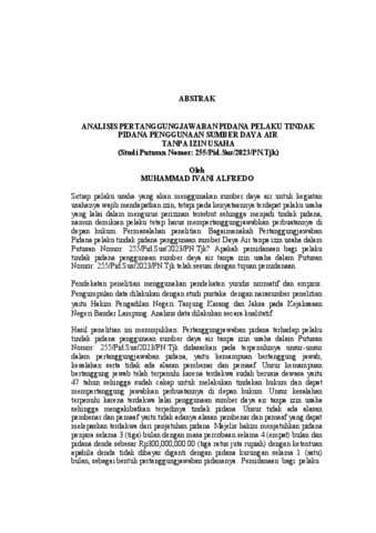 Setiap pelaku usaha yang akan menggunakan sumber daya air untuk kegiatan usahanya wajib mendapatkan izin, tetapi pada kenyataannya terdapat pelaku usaha yang lalai dalam mengurus perizinan tersebut sehingga menjadi tindak pidana, namun demikian pelaku tetap harus mempertanggungjawabkan perbuatannya di depan hukum. Permasalahan penelitian: Bagaimanakah Pertanggungjawaban Pidana pelaku tindak pidana penggunaan sumber Daya Air tanpa izin usaha dalam Putusan Nomor: 255/Pid.Sus/2023/PN.Tjk? Apakah pemidanaan bagi pelaku tindak pidana penggunaan sumber daya air tanpa izin usaha dalam Putusan Nomor: 255/Pid.Sus/2023/PN.Tjk telah sesuai dengan tujuan pemidanaan. Pendekatan penelitian menggunakan pendekatan yuridis normatif dan empiris. Pengumpulan data dilakukan dengan studi pustaka dengan narasumber penelitian yaitu Hakim Pengadilan Negeri Tanjung Karang dan Jaksa pada Kejaksaaan Negeri Bandar Lampung. Analisis data dilakukan secara kualitatif. Hasil penelitian ini menunjukkan: Pertanggungjawaban pidana terhadap pelaku tindak pidana penggunaan sumber daya air tanpa izin usaha dalam Putusan Nomor: 255/Pid.Sus/2023/PN.Tjk didasarkan pada terpenuhinya unsur-unsur dalam pertanggungjawaban pidana, yaitu kemampuan bertanggung jawab, kesalahan serta tidak ada alasan pembenar dan pemaaf. Unsur kemampuan bertanggung jawab telah terpenuhi karena terdakwa sudah berusia dewasa yaitu 47 tahun sehingga sudah cakap untuk melakukan tindakan hukum dan dapat mempertanggung jawabkan perbuatannya di depan hukum. Unsur kesalahan terpenuhi karena terdakwa lalai penggunaan sumber daya air tanpa izin usaha sehingga mengakibatkan terjadinya tindak pidana. Unsur tidak ada alasan pembenar dan pemaaf yaitu tidak adanya alasan pembenar dan pemaaf yang dapat melepaskan terdakwa dari penjatuhan pidana. Majelis hakim menjatuhkan pidana penjara selama 3 (tiga) bulan dengan masa percobaan selama 4 (empat) bulan dan pidana denda sebesar Rp300,000,000.00 (tiga ratus juta rupiah) dengan ketentuan apabila denda tidak dibayar diganti dengan pidana kurungan selama 1 (satu) bulan, sebagai bentuk pertanggungjawaban pidananya. Pemidanaan bagi pelaku 3 Muhammad Ivani Alfredo tindak pidana penggunaan sumber daya air tanpa izin usaha berupa pidana penjara selama 3 (tiga) bulan dengan masa percobaan selama 4 (empat) bulan dalam Putusan Nomor: 255/Pid.Sus/2023/PN.Tjk telah sesuai dengan tujuan pemidanaan, di mana penjatuhan pidana percobaan bertujuan untuk memperbaiki perilaku pelaku tindak pidana agar lebih taat kepada hukum dan tidak mengulangi tindak pidana dalam melaksanakan kegiatan usahanya. Saran dalam penelitian ini adalah: Hakim dalam menjatuhkan pidana terhadap pelaku hendaknya secara cermat memperhatikan apakah tindak pidana tersebut dilakukan dengan kesengajaan atau kelalaian, sehingga pidana yang dijatuhakan hakum sesuai dengan kesalahan yang dilakukan terdakwa. Aparat penegak hukum dan intsansi terkait disarankan untuk meningkatkan sosialisasi kepada pelaku usaha tentang penggunaan sumber daya air yang dizinkan dan tidak diizinkan bagi pelaku usaha. Kata Kunci: Pertanggungjawaban Pidana, Sumber Daya Air, Izin Usaha