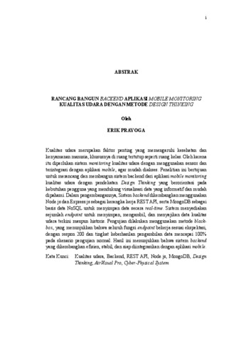 Kualitas udara merupakan faktor penting yang memengaruhi kesehatan dan kenyamanan manusia, khususnya di ruang tertutup seperti ruang kelas. Oleh karena itu diperlukan sistem monitoring kualitas udara dengan menggunakan sensor dan terintegrasi dengan aplikasi mobile, agar mudah diakses. Penelitian ini bertujuan untuk merancang dan membangun sistem backend dari aplikasi mobile monitoring kualitas udara dengan pendekatan Design Thinking yang berorientasi pada kebutuhan pengguna yang mendukung visualisasi data yang informatif dan mudah dipahami. Dalam pengembangannya, Sistem backend dikembangkan menggunakan Node.js dan Express.js sebagai kerangka kerja REST API, serta MongoDB sebagai basis data NoSQL untuk menyimpan data secara real-time. Sistem menyediakan sejumlah endpoint untuk menyimpan, mengambil, dan menyajikan data kualitas udara terkini maupun historis. Pengujian dilakukan menggunakan metode black- box, yang menunjukkan bahwa seluruh fungsi endpoint bekerja sesuai ekspektasi, dengan respon 200 dan tingkat keberhasilan pengambilan data mencapai 100% pada skenario pengujian normal. Hasil ini menunjukkan bahwa sistem backend yang dikembangkan efisien, stabil, dan siap diintegrasikan dengan aplikasi mobile. Kata Kunci: Kualitas udara, Backend, REST API, Node.js, MongoDB, Design Thinking, AirVisual Pro, Cyber-Physical System Air quality is an important factor that affects human health and comfort, especially in enclosed spaces such as classrooms. Therefore, an air quality monitoring system is needed using sensors integrated with a mobile application to ensure accessibility. This study aims to design and develop the backend system of a mobile air quality monitoring application using a Design Thinking approach that focuses on user needs and supports informative and easy-to-understand data visualization. The backend system was developed using Node.js and Express.js as the REST API framework, and MongoDB as the NoSQL Database to store data in real time. The system provides several endpoints to store, retrieve, and present both real-time and historical air quality data. Testing was carried out using the black-box method, which showed that all endpoint functions performed as expected, returning HTTP 200 responses and achieving a 100% data retrieval success rate under normal test scenarios. These results indicate that the developed backend system is efficient, stable, and ready to be integrated with a mobile application. Keywords: Air quality, Backend, REST API, Node.js, MongoDB, Design Thinking, AirVisual Pro, Cyber-Physical System