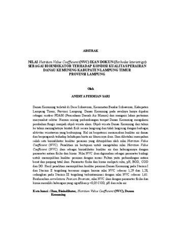 ANIDITA , FERMIAN SARI (2025) NILAI Nutrition Value Coefficient (NVC) IKAN DOKUN (Barbodes lateristriga) SEBAGAI BIOINDIKATOR TERHADAP KONDISI KUALITAS PERAIRAN DANAU KEMUNING KABUPATEN LAMPUNG TIMUR PROVINSI LAMPUNG. FAKULTAS MATEMATIKA DAN ILMU PENGETAHUAN ALAM, UNIVERSITAS LAMPUNG.